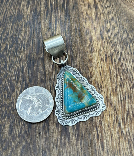 Navajo Handmade Sterling Silver Royston Turquoise Stamped Design Drop Pendant