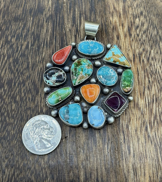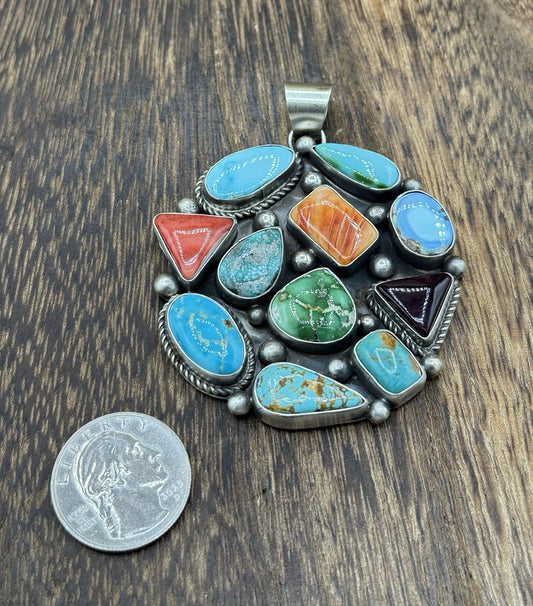 Navajo Handmade Sterling Silver Mixed Turquoise Spiny Large Cluster Pendant