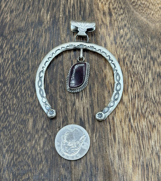 Navajo Handmade Sterling Silver Stamped Red Spiny Oyster Shell Naja Pendant