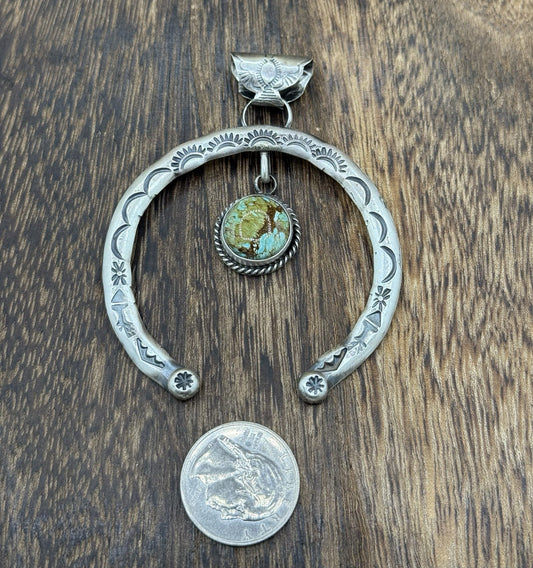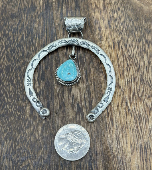 Navajo Handmade Sterling Silver Stamped Blue Glacier Turquoise Naja Pendant