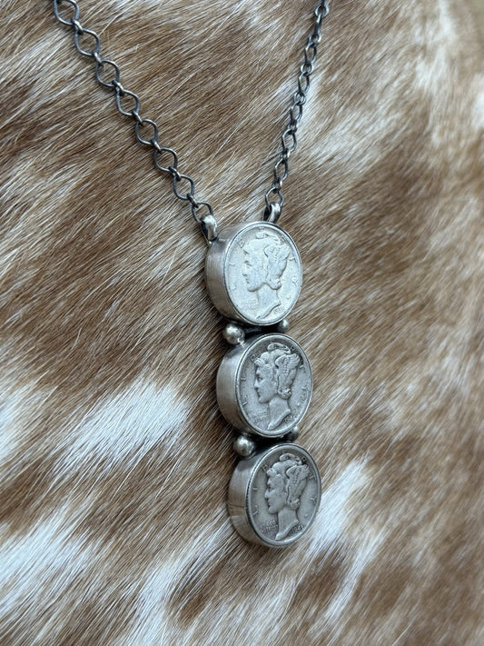 Navajo Handmade Sterling Silver Liberty Dime Cluster Bar Lariat Necklace 18”