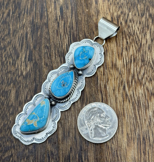 Native Navajo Handmade Sterling Silver Blue Bird Turquoise Stamped Drop Pendant