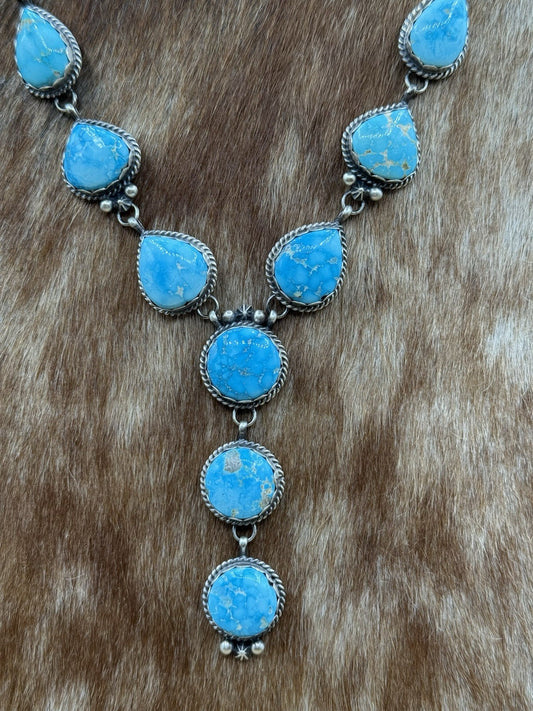 Native Navajo Handmade Sterling Silver Blue Bird Turquoise Y Lariat Necklace 24”