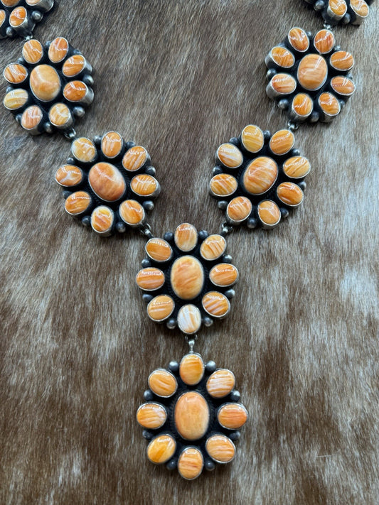 Navajo Handmade Silver Orange Spiny Oyster Cluster Lariat Dangle Necklace 24”