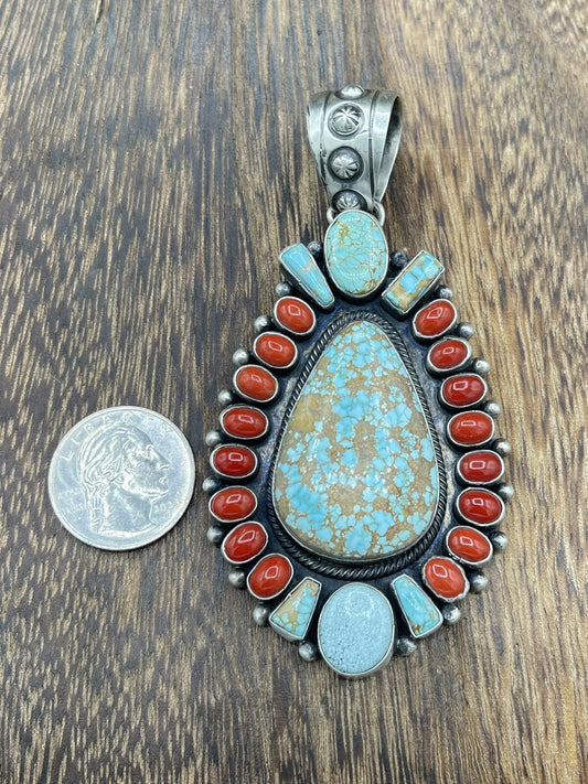 Native American Indian Navajo Handmade Silver Turquoise & Coral Cluster Pendant