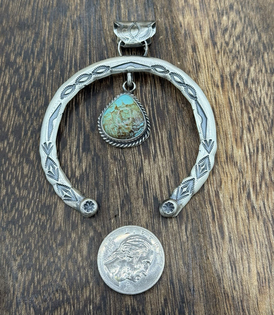 Navajo Handmade Sterling Silver Stamped Blue Glacier Turquoise Naja Pendant