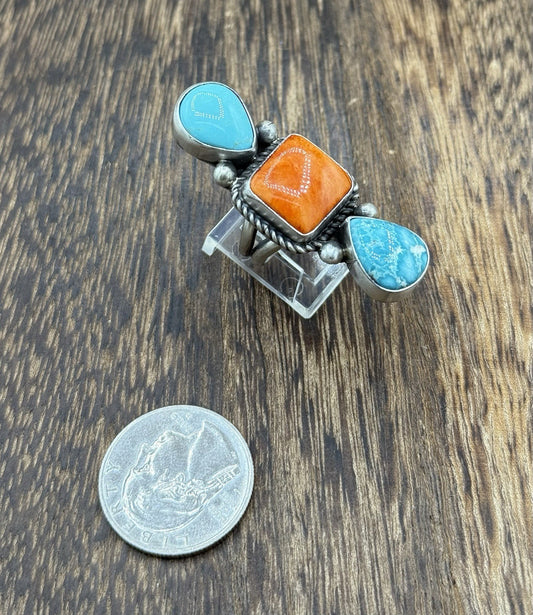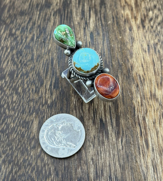 Native Navajo Handmade Sterling Silver Mixed Stone Turquoise Cluster Ring Size 7