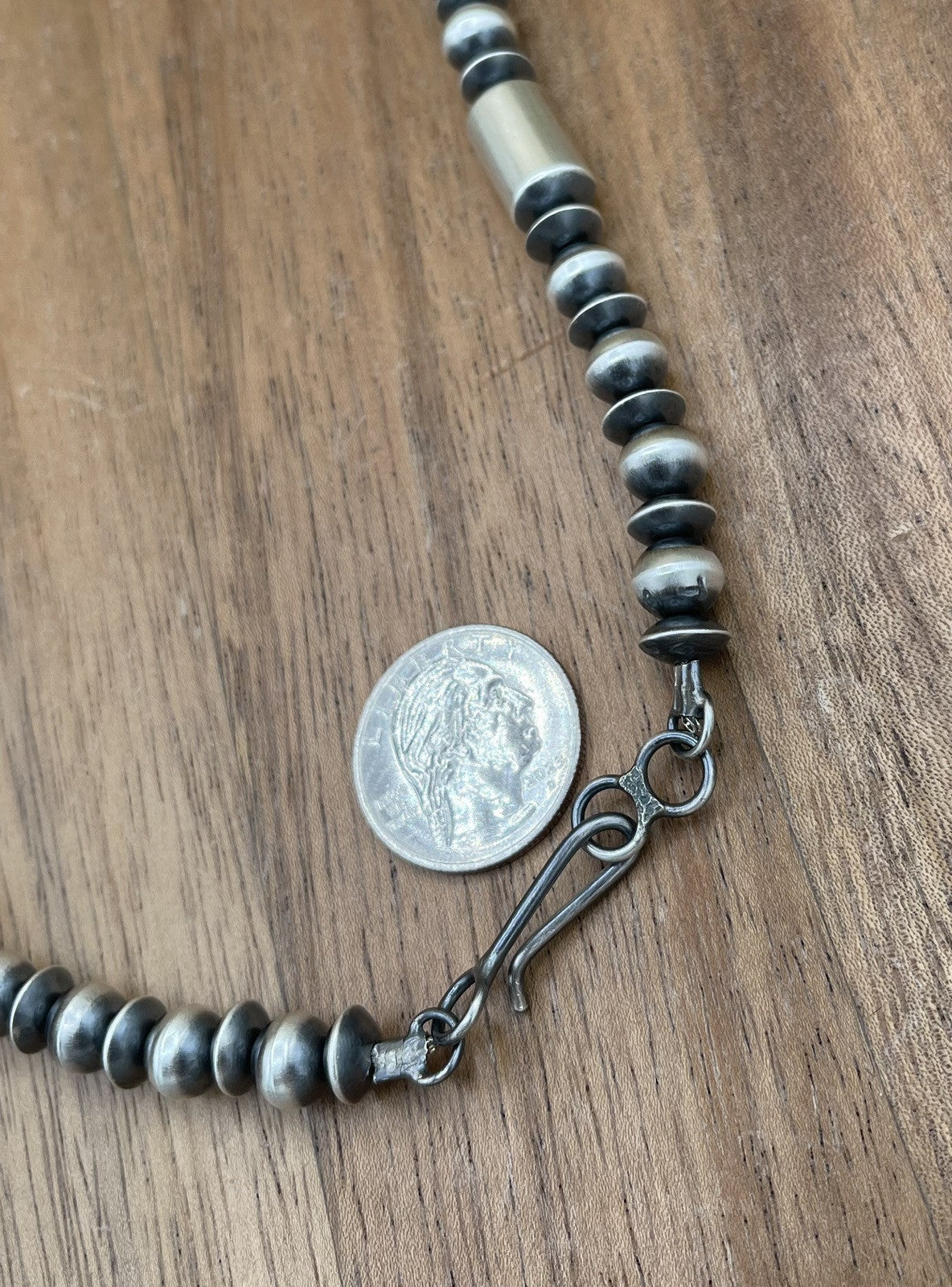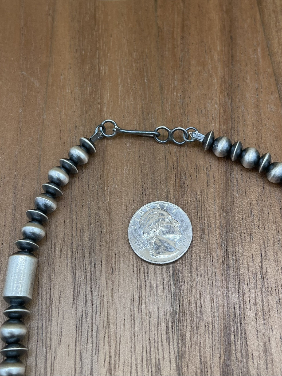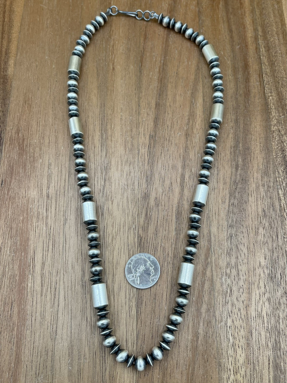 Authentic Native American Navajo pearl necklace handmade sterling silver pearl beads. The necklace has a hook closure and a ball/bead chain type. The set is handmade by artisan Tonisha Haley. The necklace is designed for unisex adults and is suitable for various occasions such as Mother's Day, engagement, wedding, graduation, Christmas, anniversary, Father's Day, birthday, christening, confirmation/communion, and Valentine's Day.