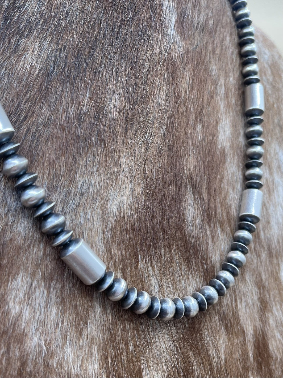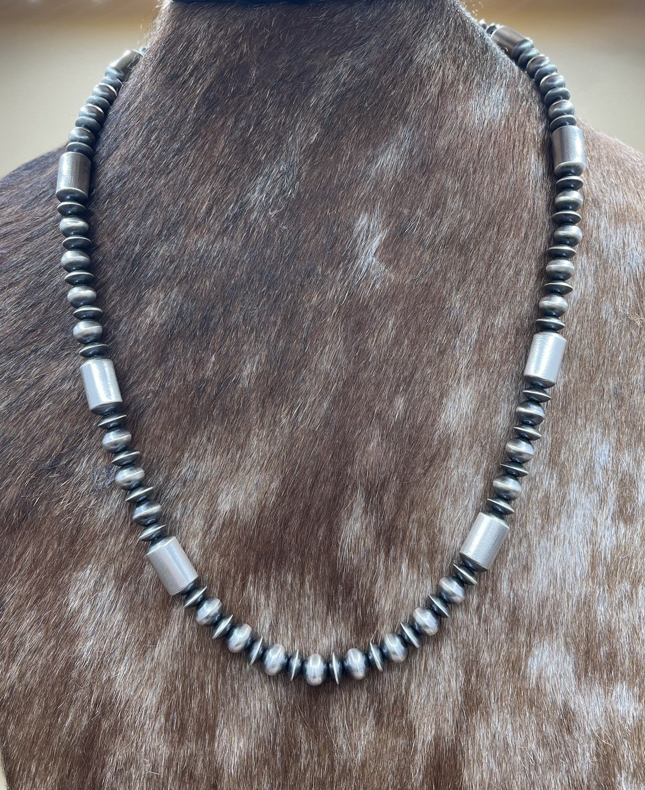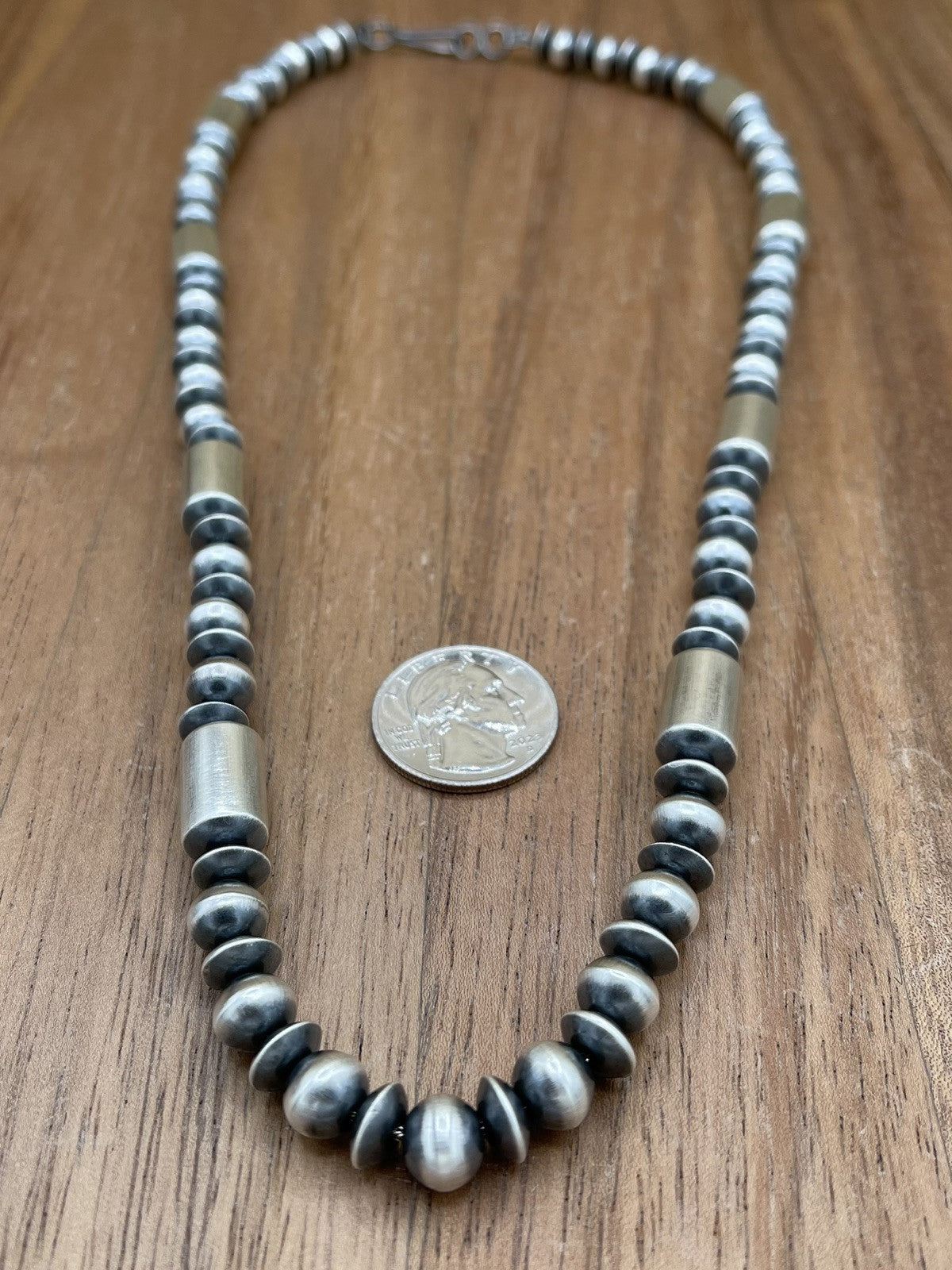 Authentic Native American Navajo pearl necklace handmade sterling silver pearl beads. The necklace has a hook closure and a ball/bead chain type. The set is handmade by artisan Tonisha Haley. The necklace is designed for unisex adults and is suitable for various occasions such as Mother's Day, engagement, wedding, graduation, Christmas, anniversary, Father's Day, birthday, christening, confirmation/communion, and Valentine's Day.