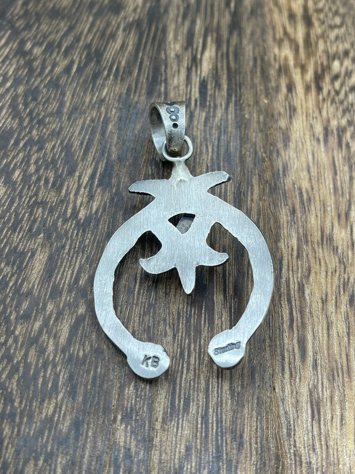 This beautiful pendant is a true work of art. Handmade by Kevin Billah, a Native American artisan, it features a unique dangle shape and a bezel setting style. The pendant is made of 925 sterling silver and adorned with a stunning Pink Concho stone.
