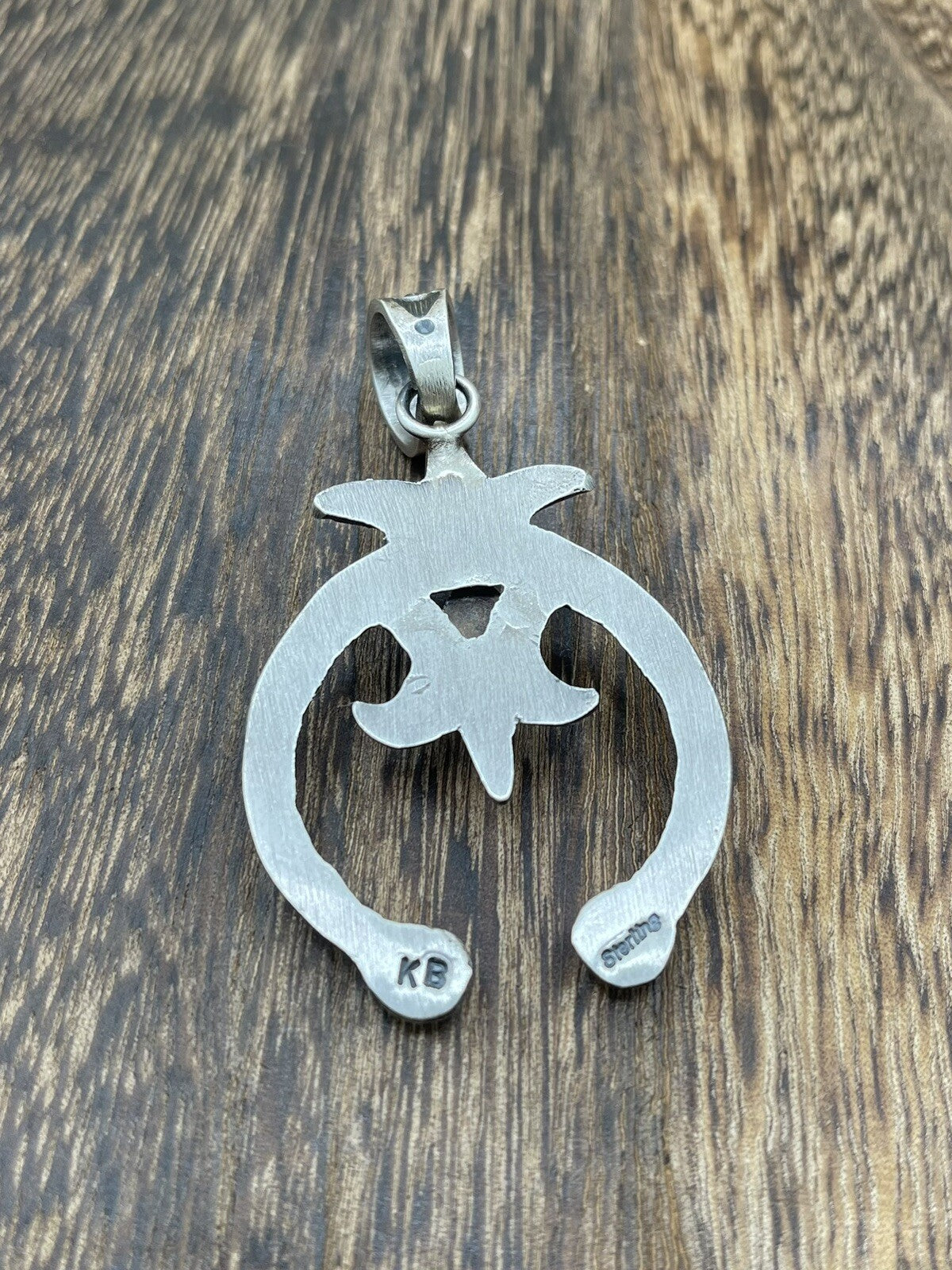 This beautiful pendant is a true work of art. Handmade by Kevin Billah, a Native American artisan, it features a unique dangle shape and a bezel setting style. The pendant is made of 925 sterling silver and adorned with a stunning Pink Concho stone.
