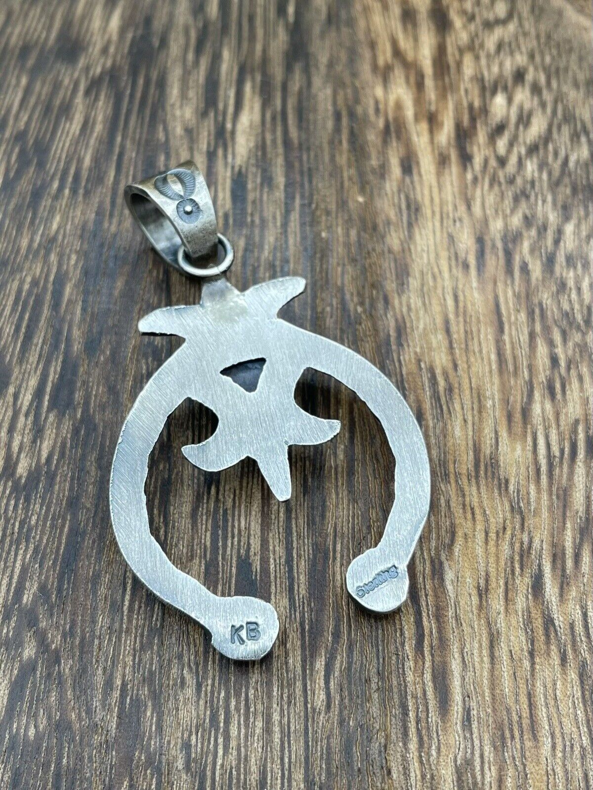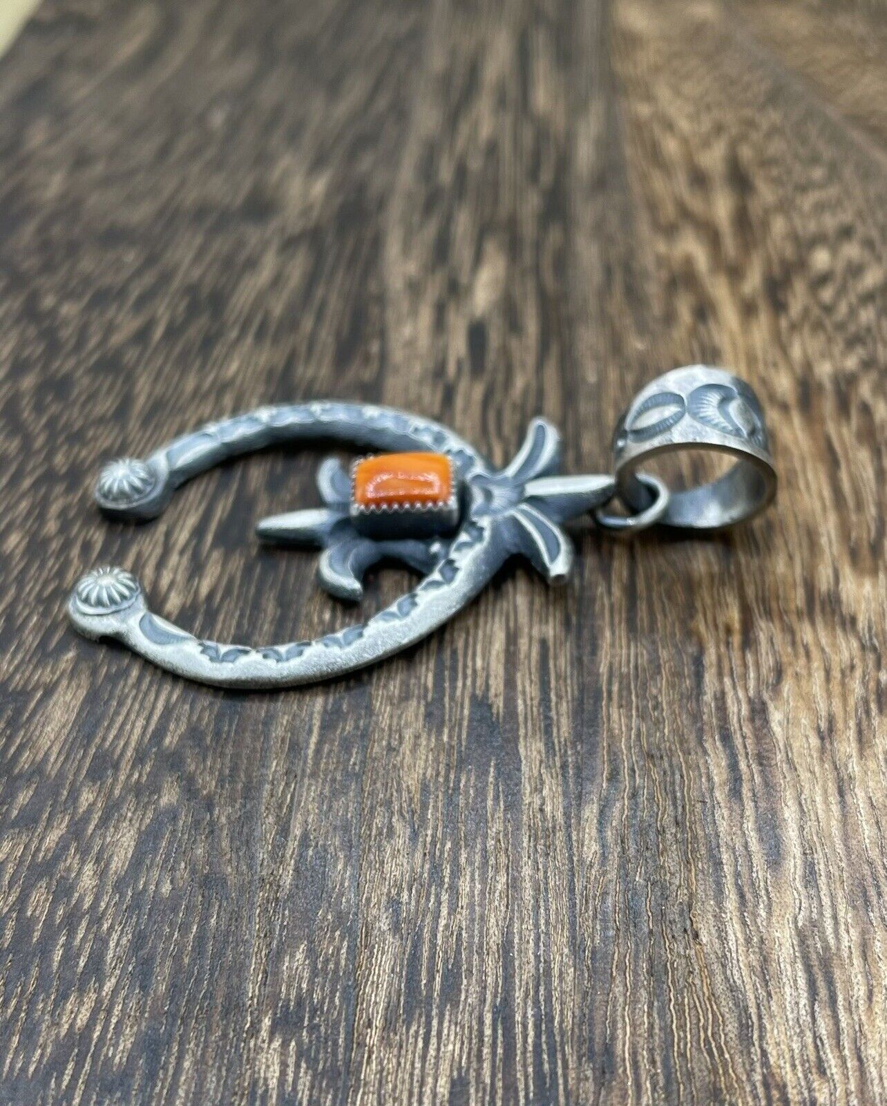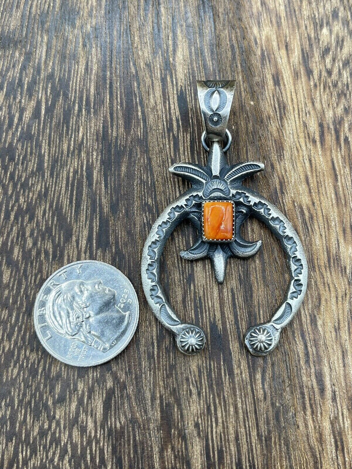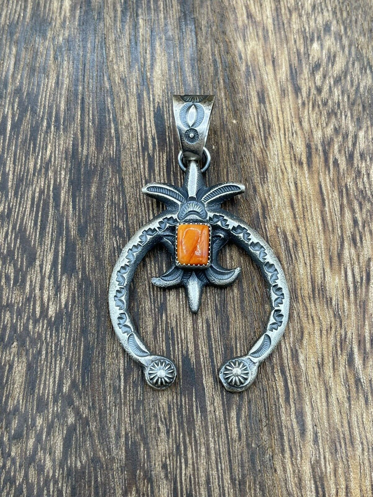This beautiful pendant is a true work of art. Handmade by Kevin Billah, a Native American artisan, it features a unique dangle shape and a bezel setting style. The pendant is made of 925 sterling silver and adorned with a stunning Orange spiny oyster shell stone.
