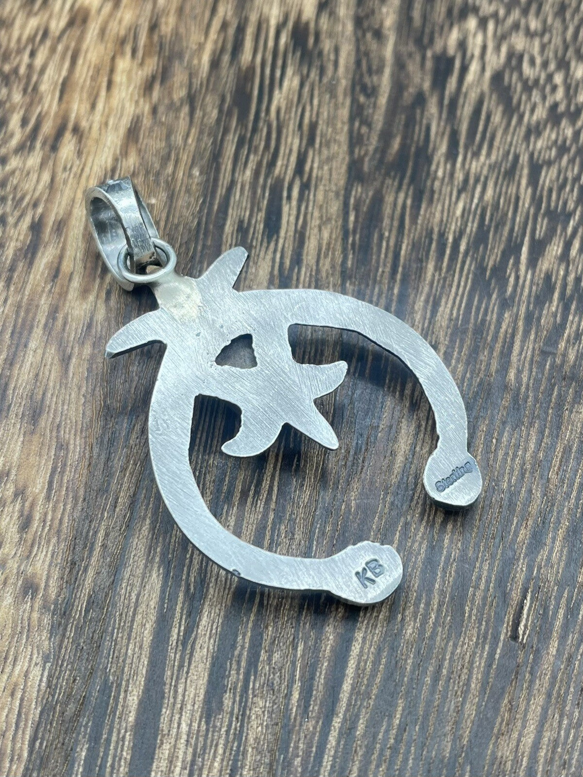 This beautiful pendant is a true work of art. Handmade by Kevin Billah, a Native American artisan, it features a unique dangle Naja shape and a bezel setting style. The pendant is made of .925 sterling silver and adorned with a stunning natural kingman turquoise stone.