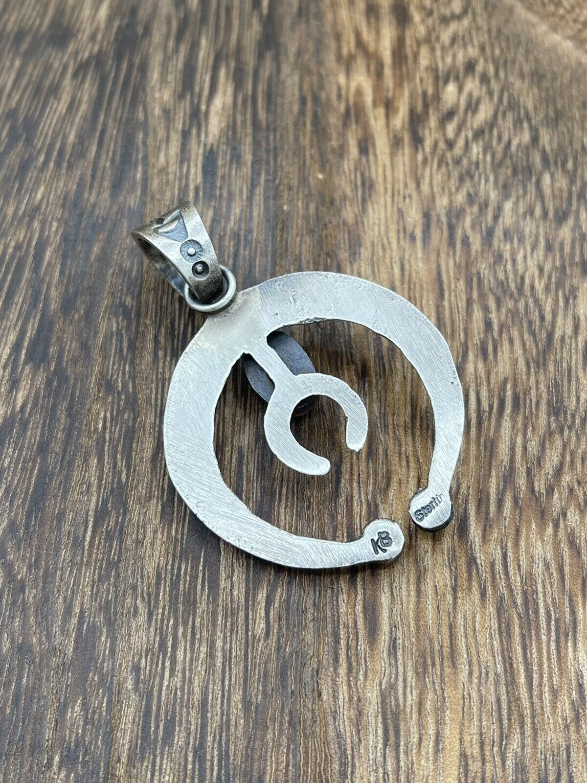 This beautiful pendant is a true work of art. Handmade by Kevin Billah, a Native American artisan, it features a unique dangle shape and a bezel setting style. The pendant is made of 925 sterling silver and adorned with a stunning Kingman Turquoise stone.
