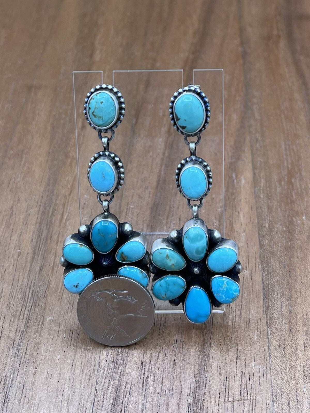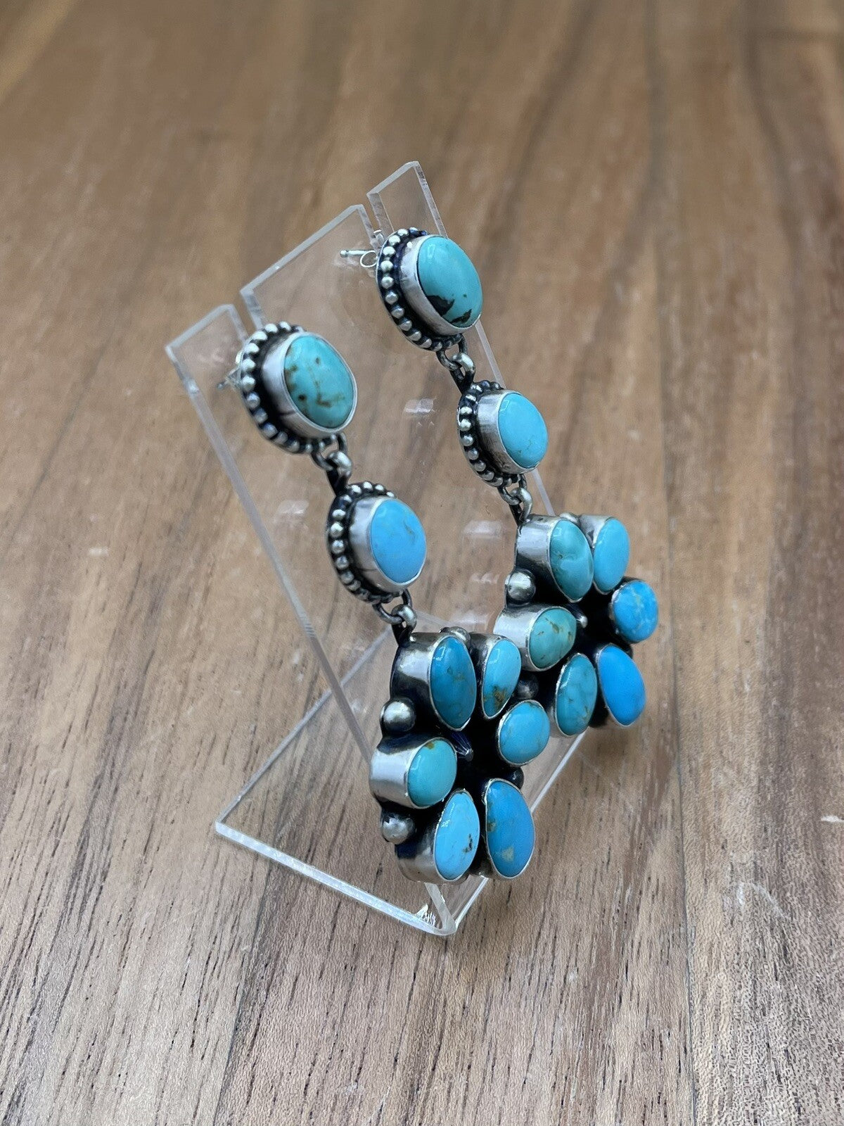 Native American Navajo Handmade Silver Kingman Turquoise Dangle Cluster Earrings