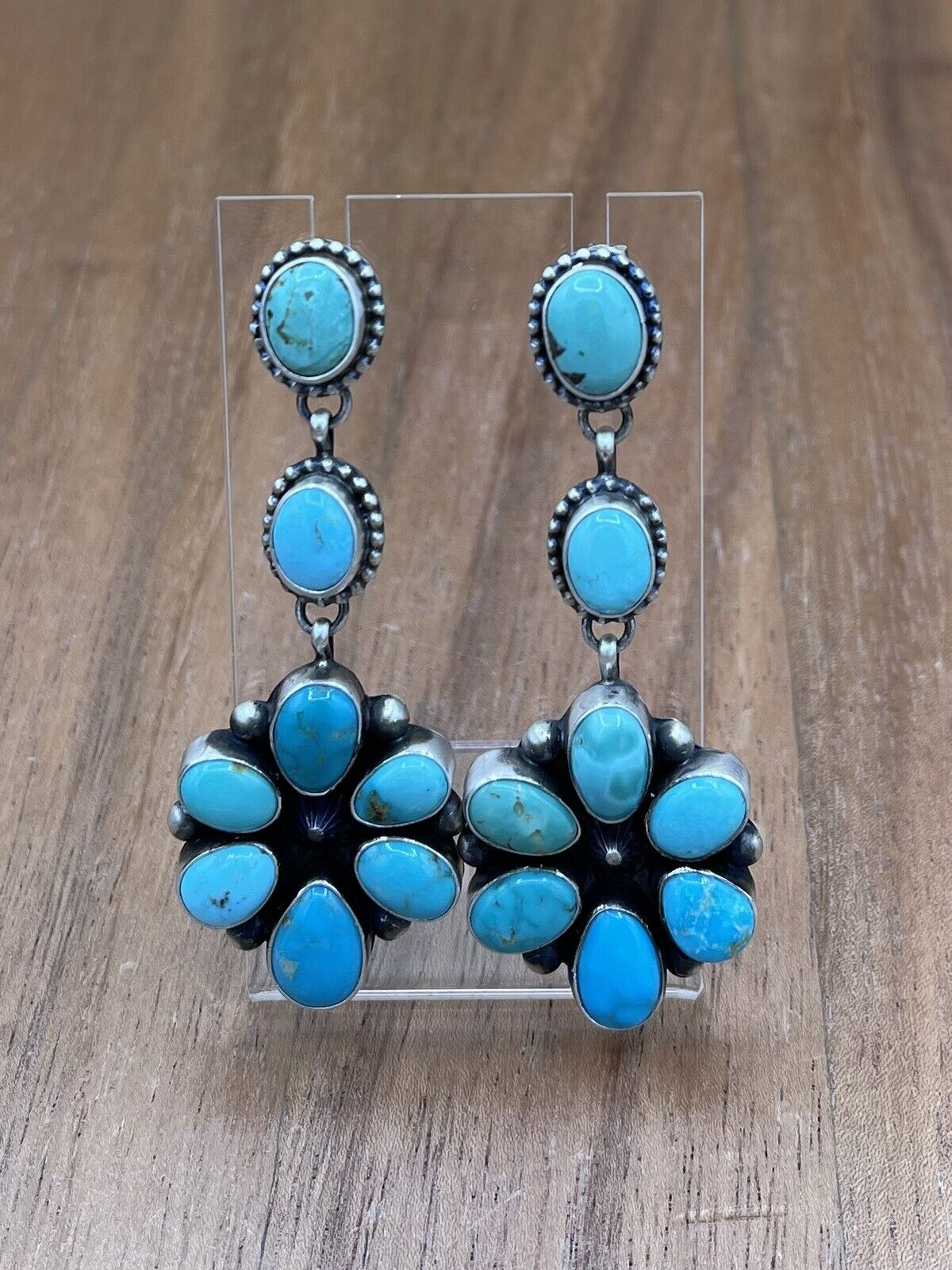 Native American Navajo Handmade Silver Kingman Turquoise Dangle Cluster Earrings