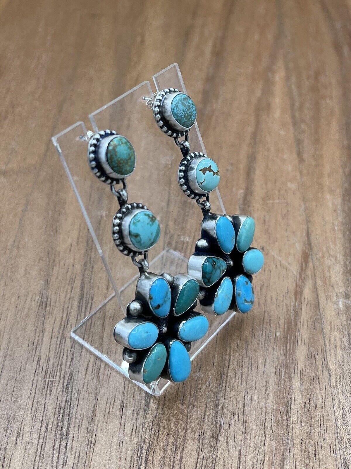 Native American Navajo Handmade Silver Kingman Turquoise Dangle Cluster Earrings