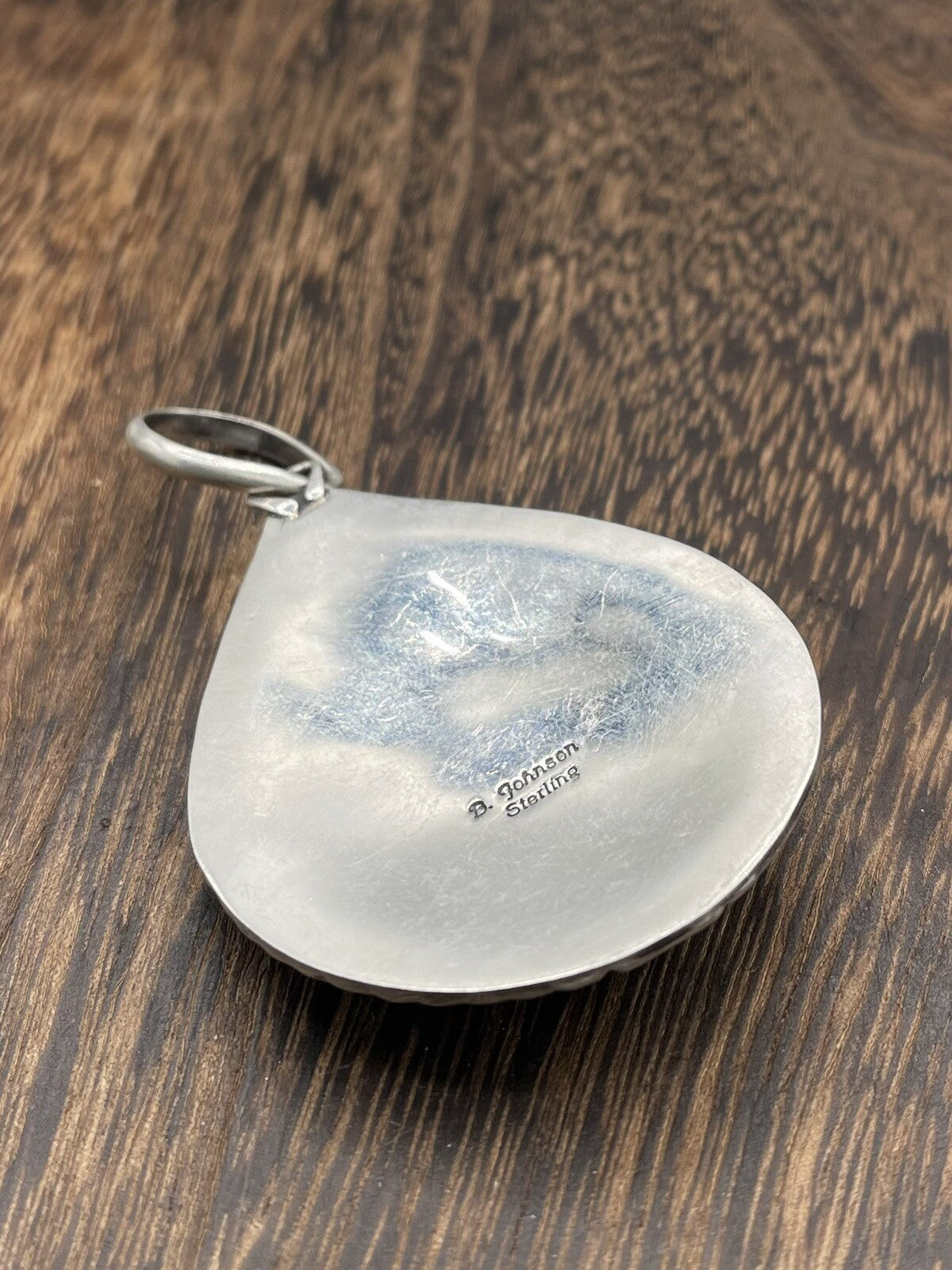 This beautiful pendant is a true work of art. Handmade by Ben Johnson, a Native American artisan. The pendant is made of 925 sterling silver and adorned with a stunning natural royston turquoise stones.