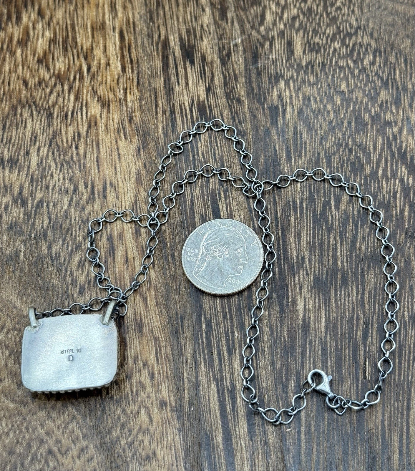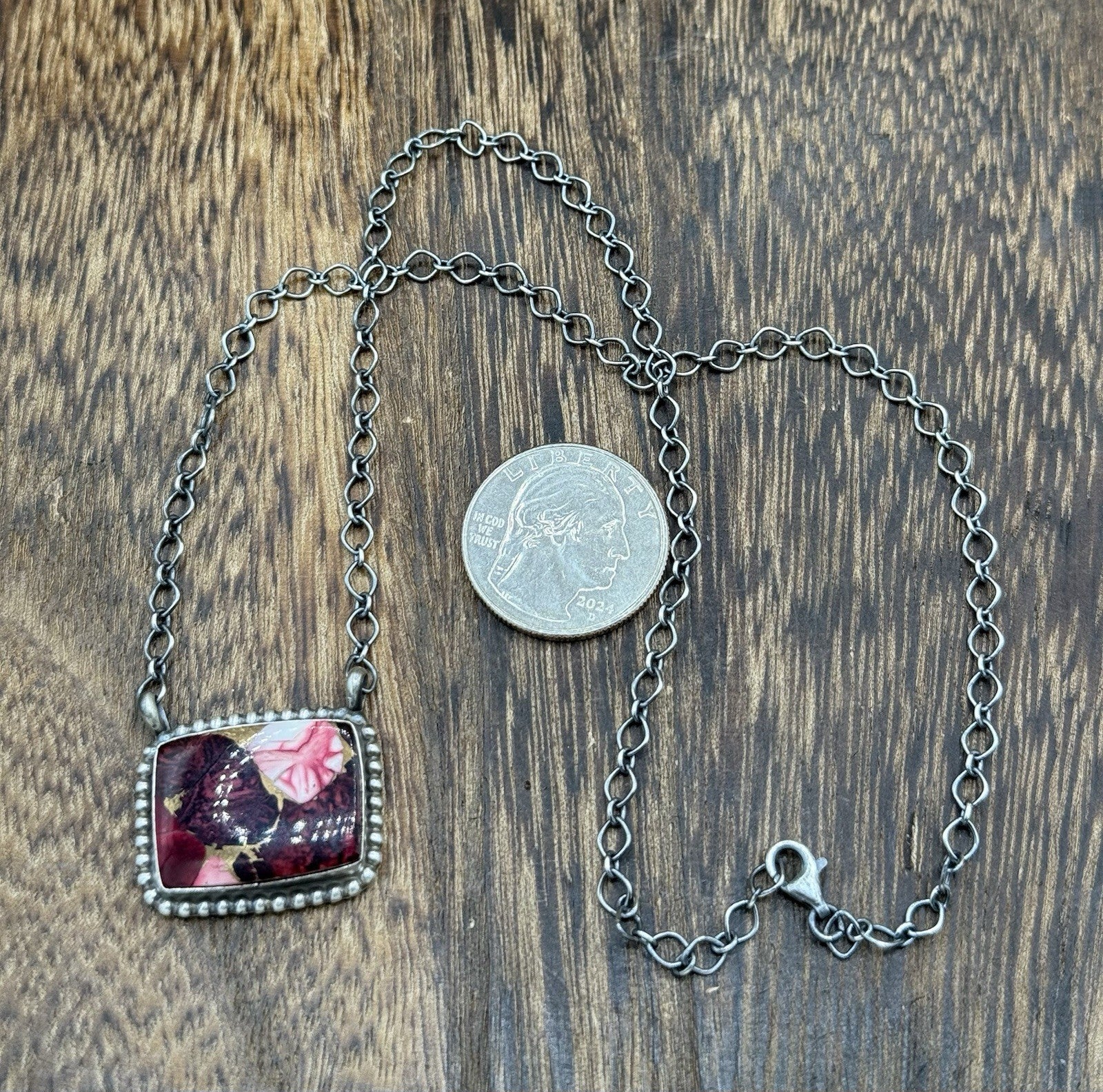 This exquisite necklace is a true work of art handcrafted by Native American artisan Debra Smith, The stunning bar shaped necklace features a beautiful dyed compressed dahlia rose stone set in .925 sterling silver. The pendant hangs on an 18-inch chain with lobster closure, making it a perfect accessory for any occasion.