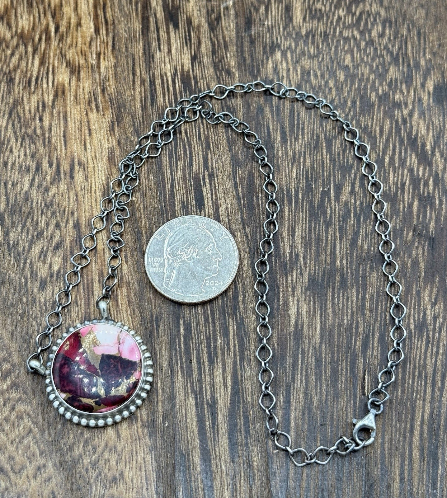 This exquisite necklace is a true work of art handcrafted by Native American artisan Debra Smith, The stunning bar shaped necklace features a beautiful dyed compressed dahlia rose stone set in .925 sterling silver. The pendant hangs on an 18-inch chain with lobster closure, making it a perfect accessory for any occasion.