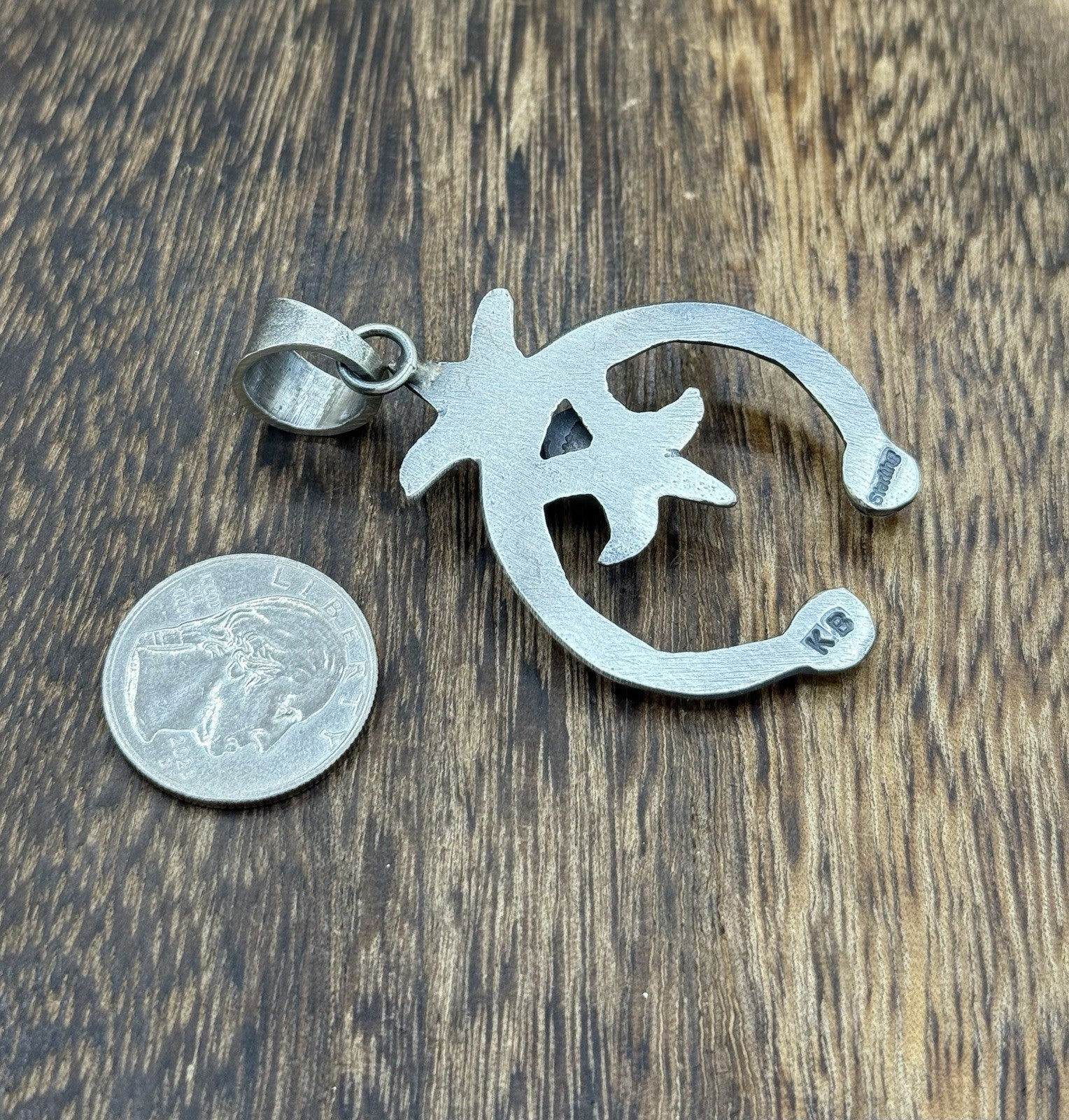 This beautiful pendant is a true work of art. Handmade by Kevin Billah, a Native American artisan, it features a unique dangle shape and a bezel setting style. The pendant is made of 925 sterling silver and adorned with a stunning Pink Conch shell stone.