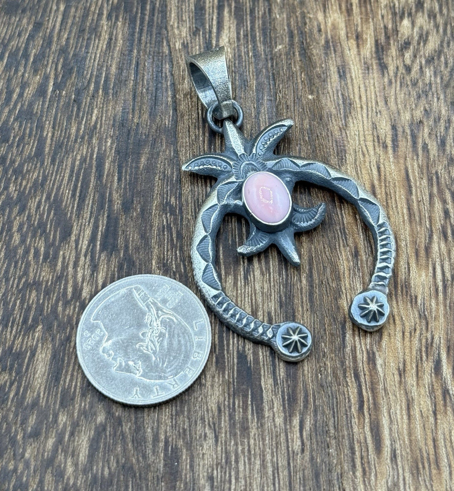 Native American Navajo Handmade Sterling Silver Old Look Pink Conch Naja Pendant