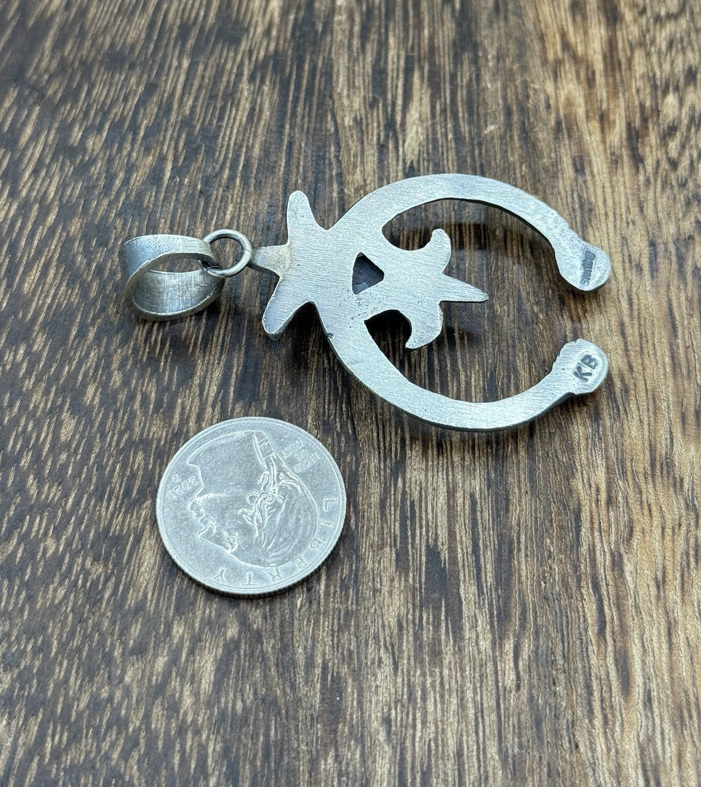 This beautiful pendant is a true work of art. Handmade by Kevin Billah, a Native American artisan, it features a unique dangle shape and a bezel setting style. The pendant is made of 925 sterling silver and adorned with a stunning Pink Conch shell stone.