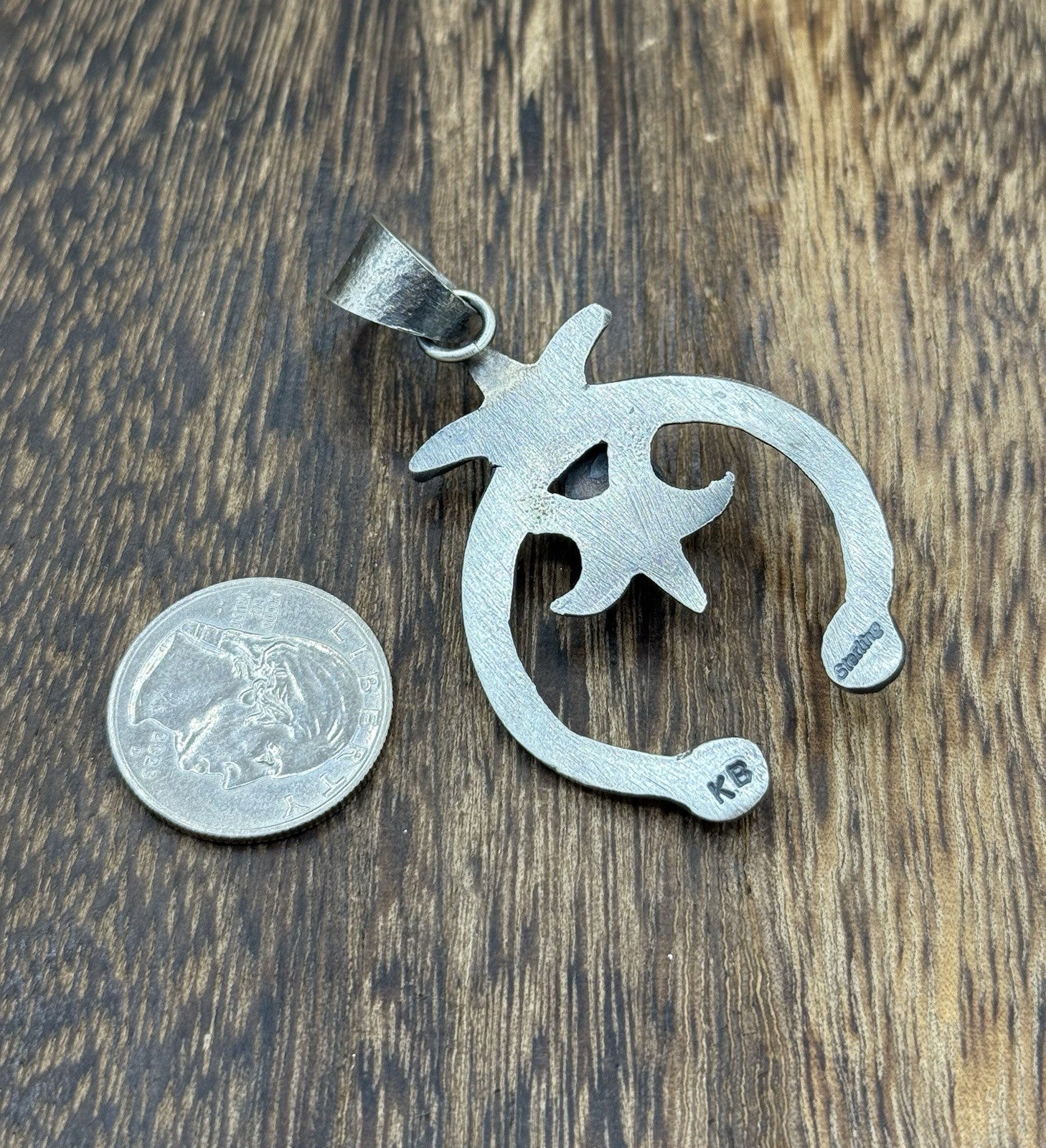 This beautiful pendant is a true work of art. Handmade by Kevin Billah, a Native American artisan, it features a unique dangle shape and a bezel setting style. The pendant is made of 925 sterling silver and adorned with a stunning Pink Conch shell stone.