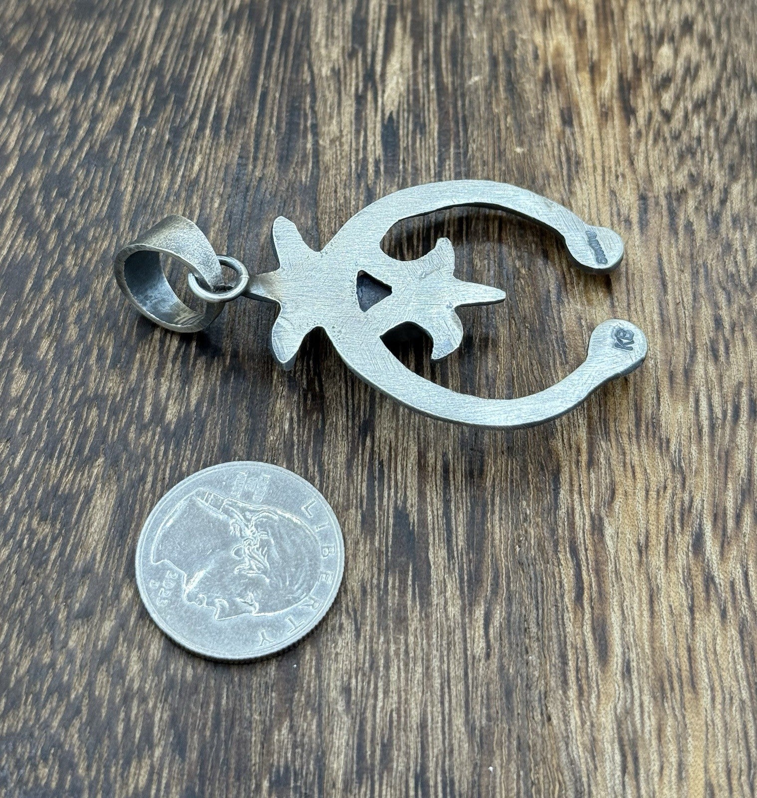 This beautiful pendant is a true work of art. Handmade by Kevin Billah, a Native American artisan, it features a unique dangle shape and a bezel setting style. The pendant is made of 925 sterling silver and adorned with a stunning Pink Conch shell stone.