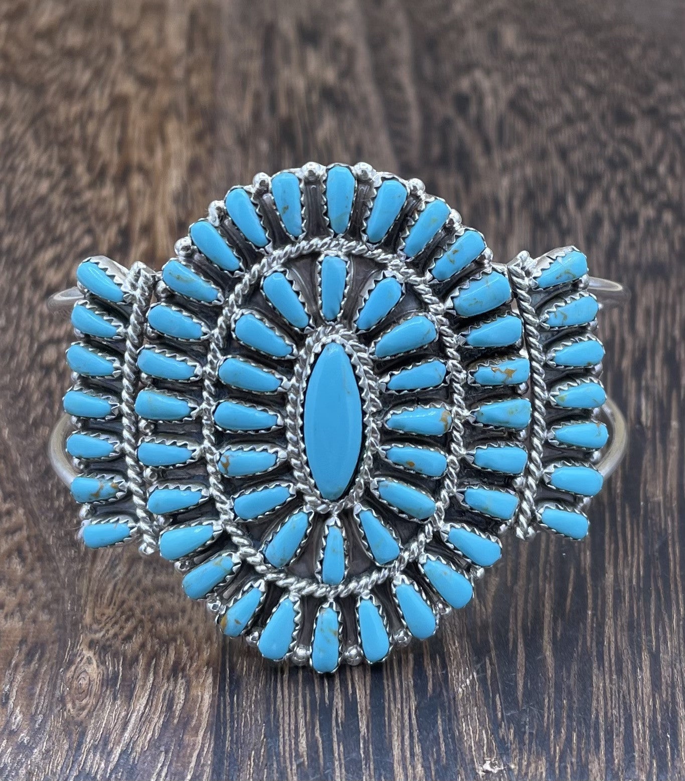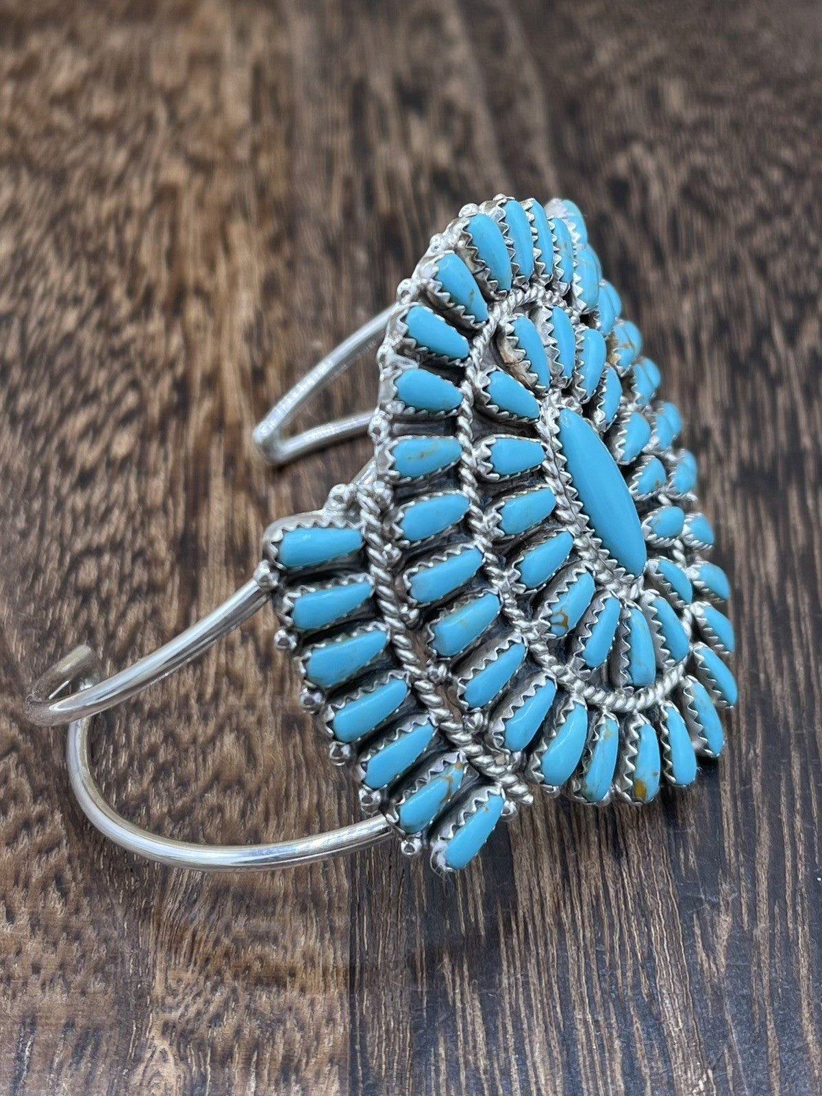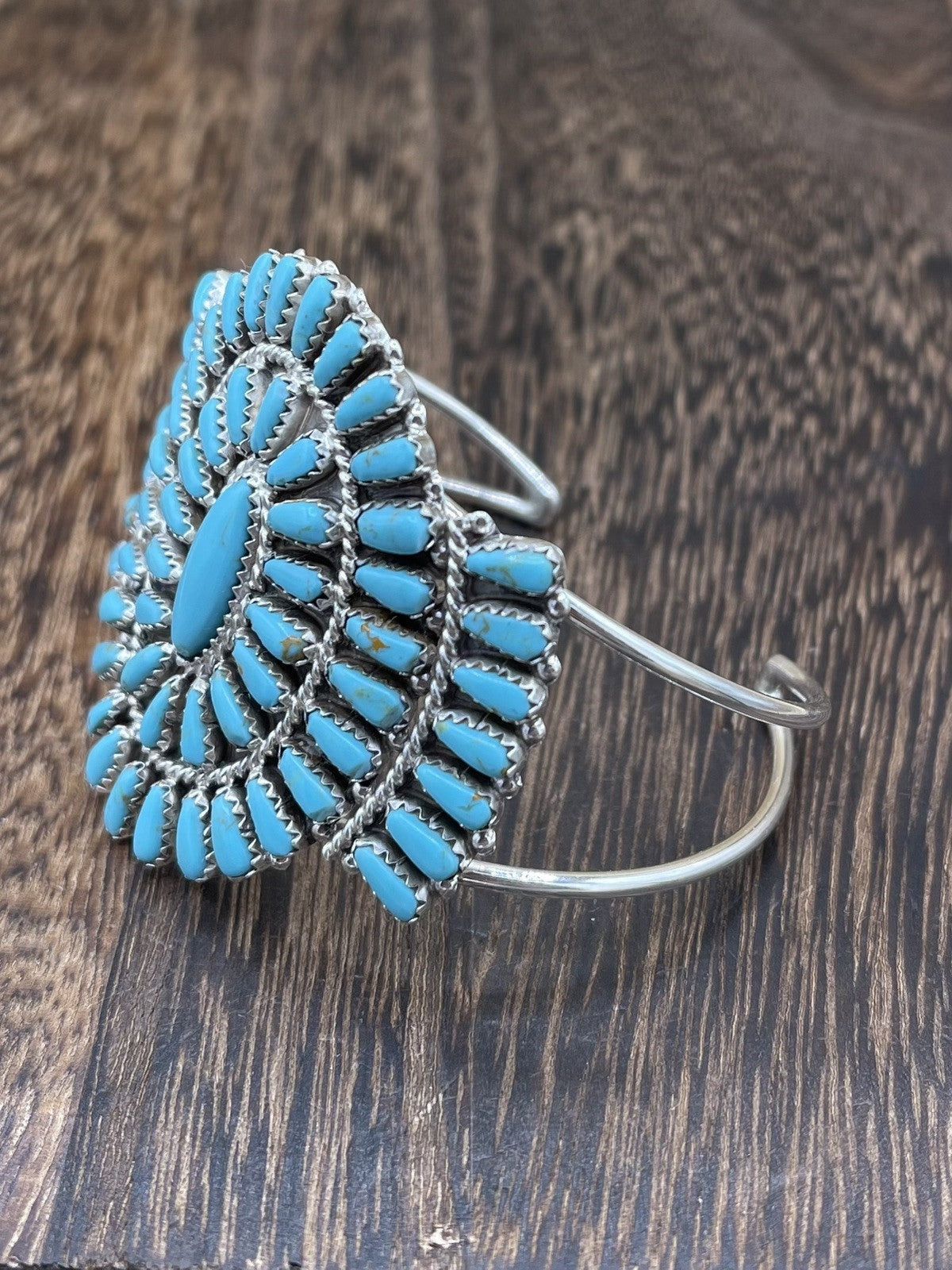 This beautiful bracelet is a true work of art by Native American craftsmen Davina Benally. The sterling silver cuff features a stunning cluster of turquoise stones, each with a unique blue color. The bracelet is perfect for anyone who loves ethnic and regional jewelry, and it would make a great addition to any collection.