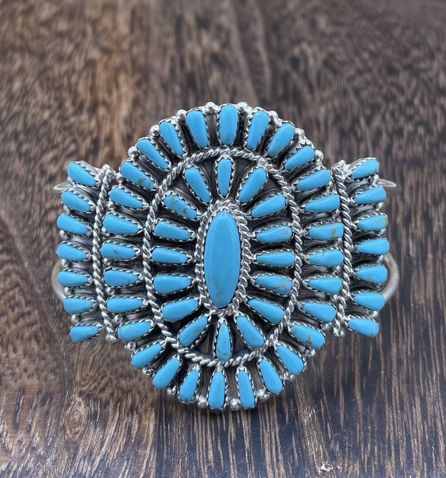 This beautiful bracelet is a true work of art by Native American craftsmen Davina Benally. The sterling silver cuff features a stunning cluster of turquoise stones, each with a unique blue color. The bracelet is perfect for anyone who loves ethnic and regional jewelry, and it would make a great addition to any collection.