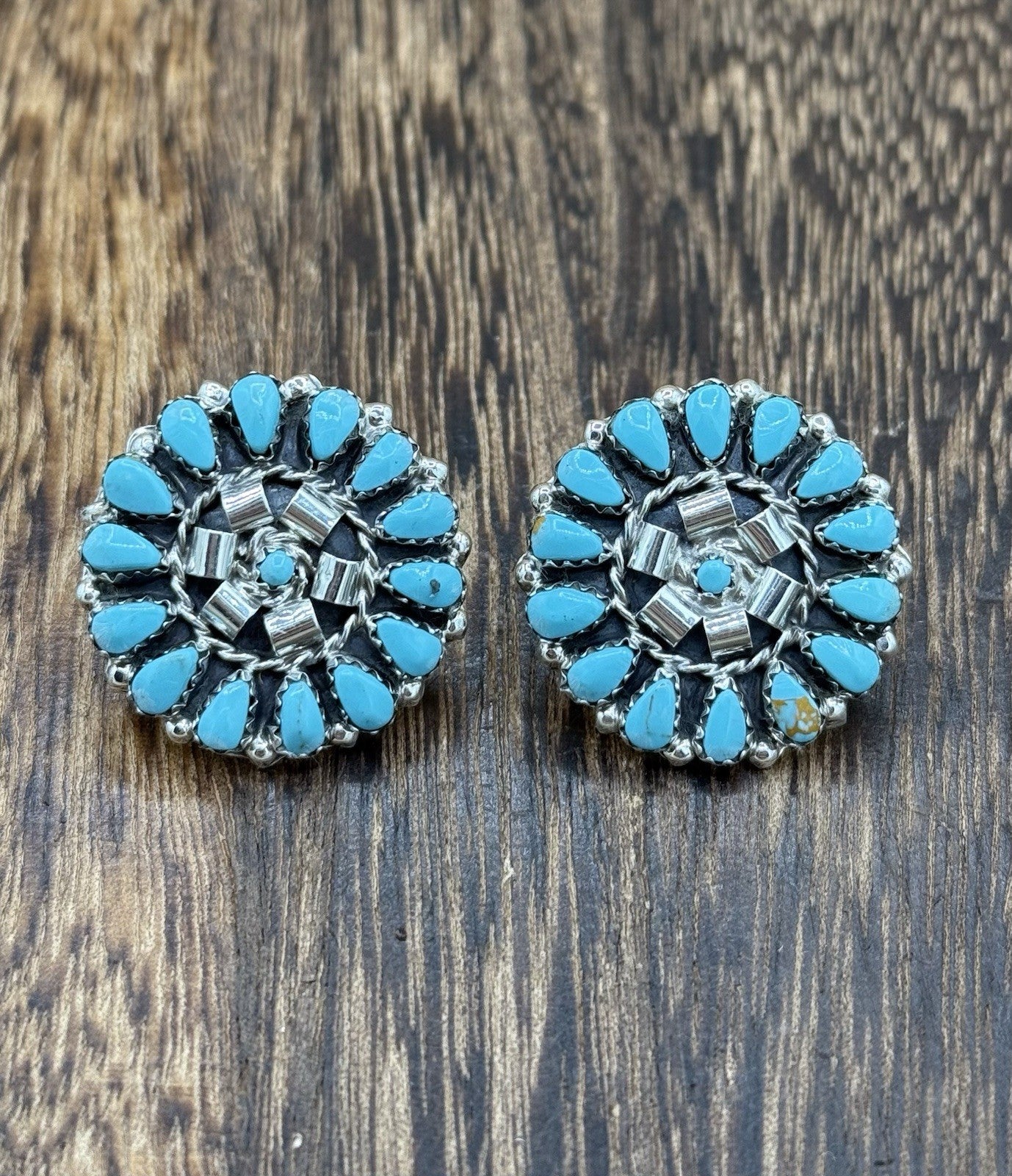 These Native American Navajo Handmade Sterling Silver Turquoise Cluster Post earrings are a stunning piece of jewelry that showcases the beauty of nature and traditional art. The blue block turquoise stones are set in a cluster on posts. These earrings are made by artist (MB) Mathilda Benally.