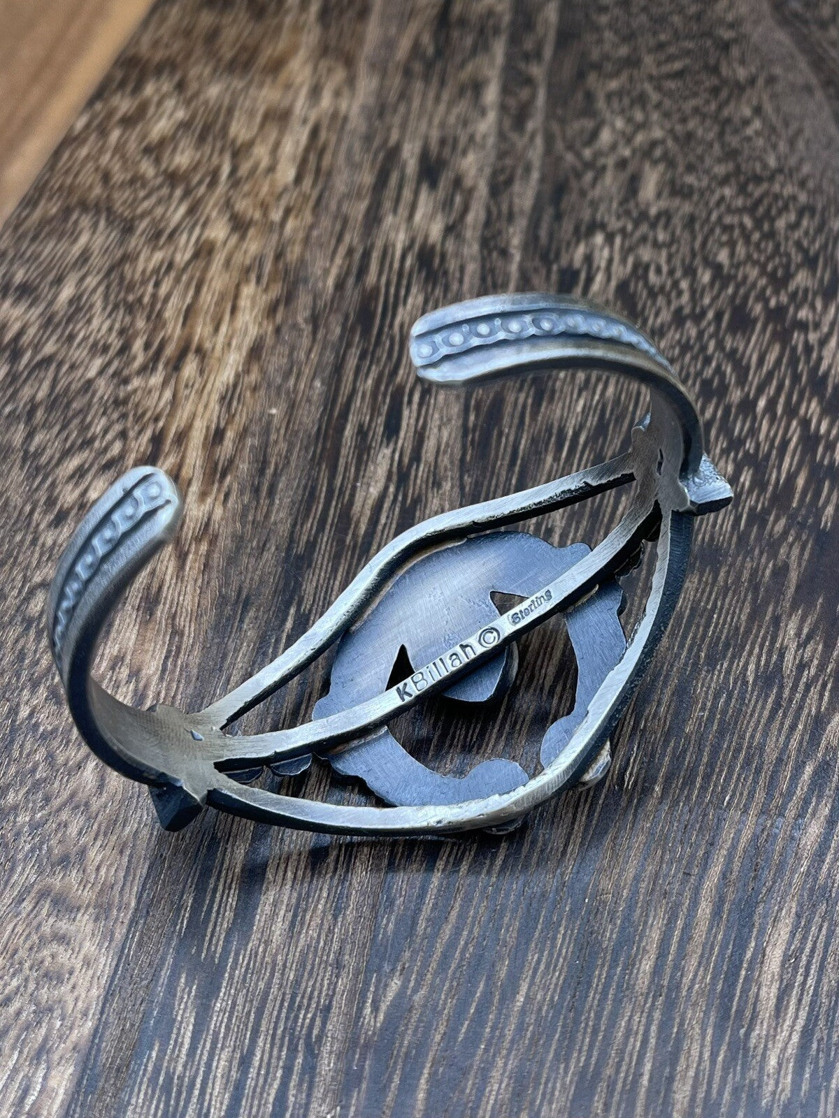 This stunning bracelet is a piece of Native American artistry at its finest. Handmade by Kevin Billah, this sterling silver cuff features a beautiful Kingman turquoise stone set in bezel. The bracelet has a unique Naja shape and is perfect for any occasion, from Mother's Day to weddings and graduations.