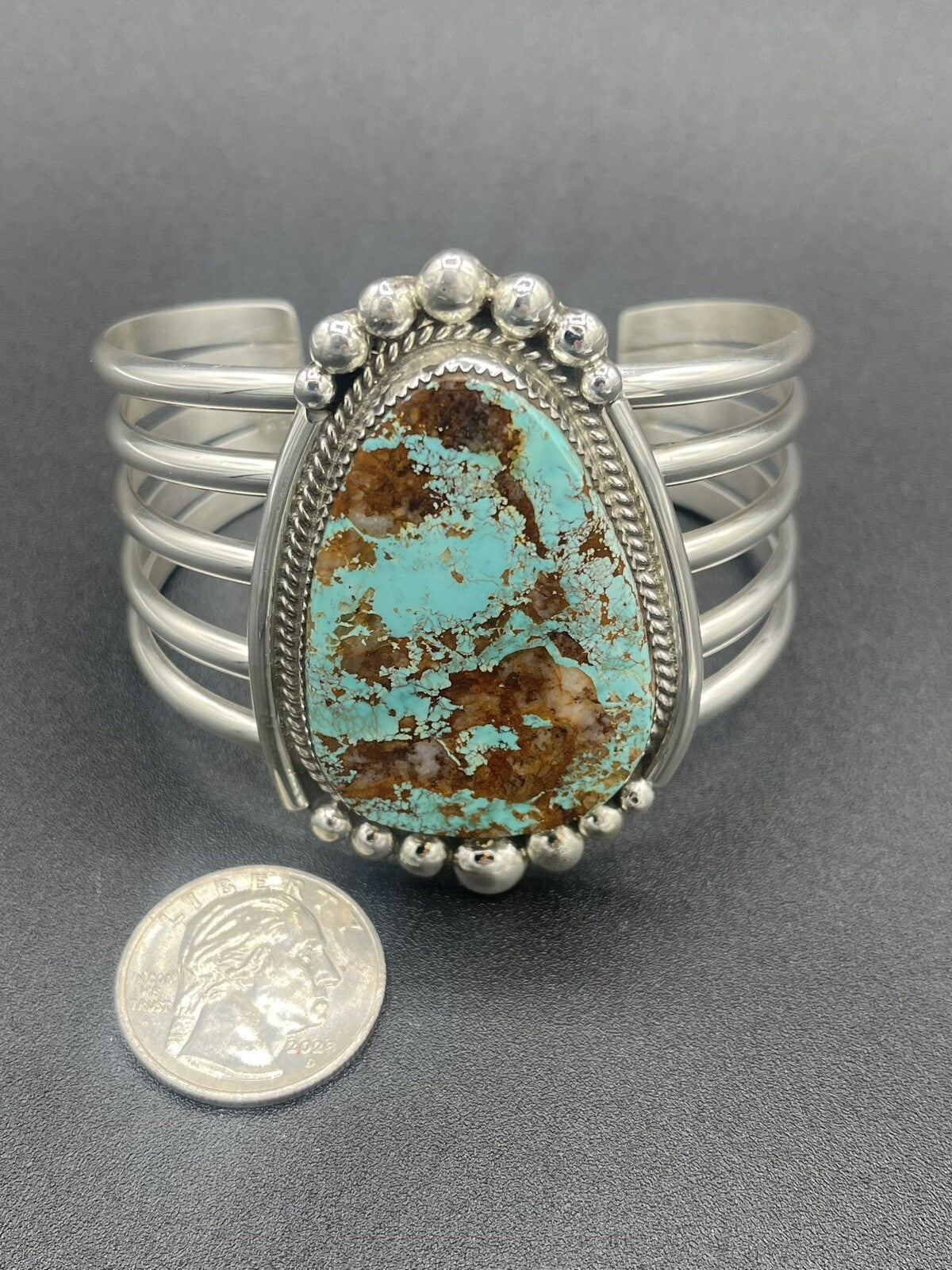 This Native American handmade cuff bracelet features A beautiful natural Royston turquoise stone. The intricate design and attention to detail make this bracelet a true beauty. The Navajo tribal affiliation adds to the authenticity and uniqueness of this piece.