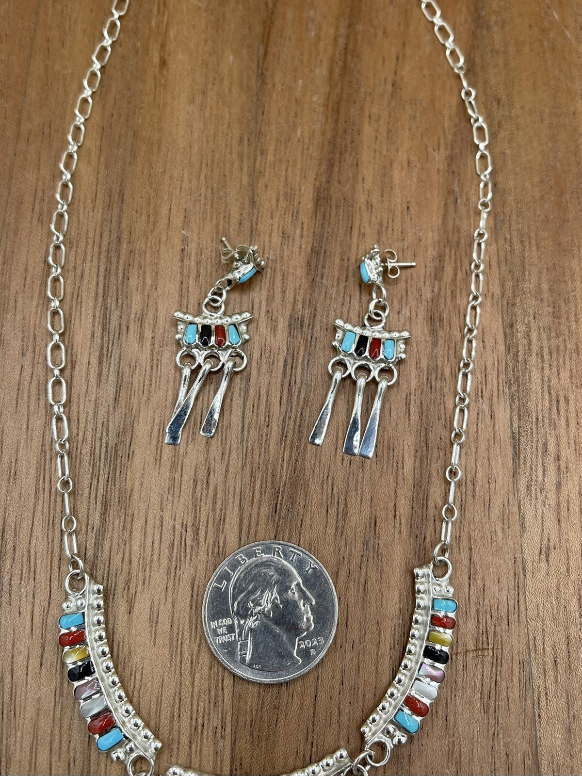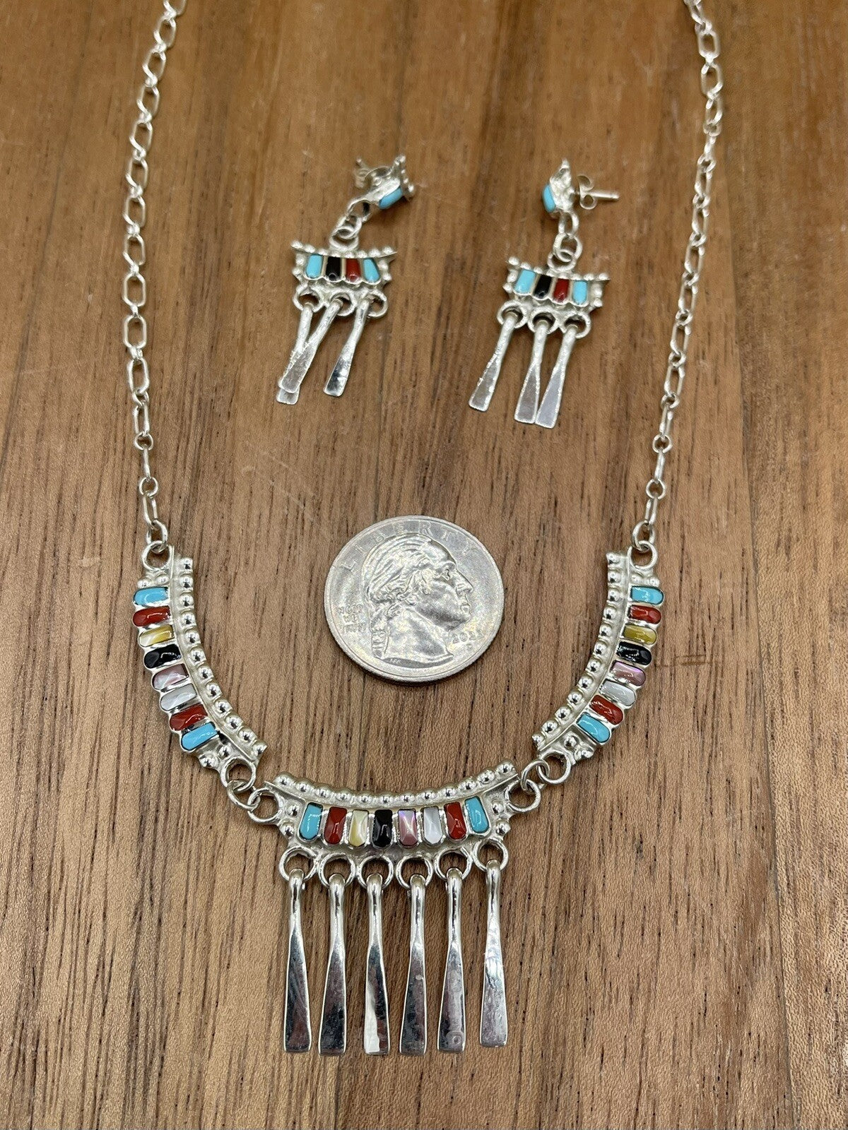Native American Zuni handmade Sterling Silver Multi Stone Inlay Dangle Necklace