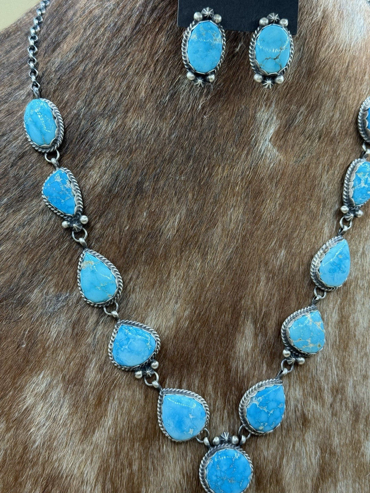 This exquisite necklace showcases the rich heritage of Native American art. Handmade by Debra Smith. This necklace features beautiful blue bird Turquoise stones.