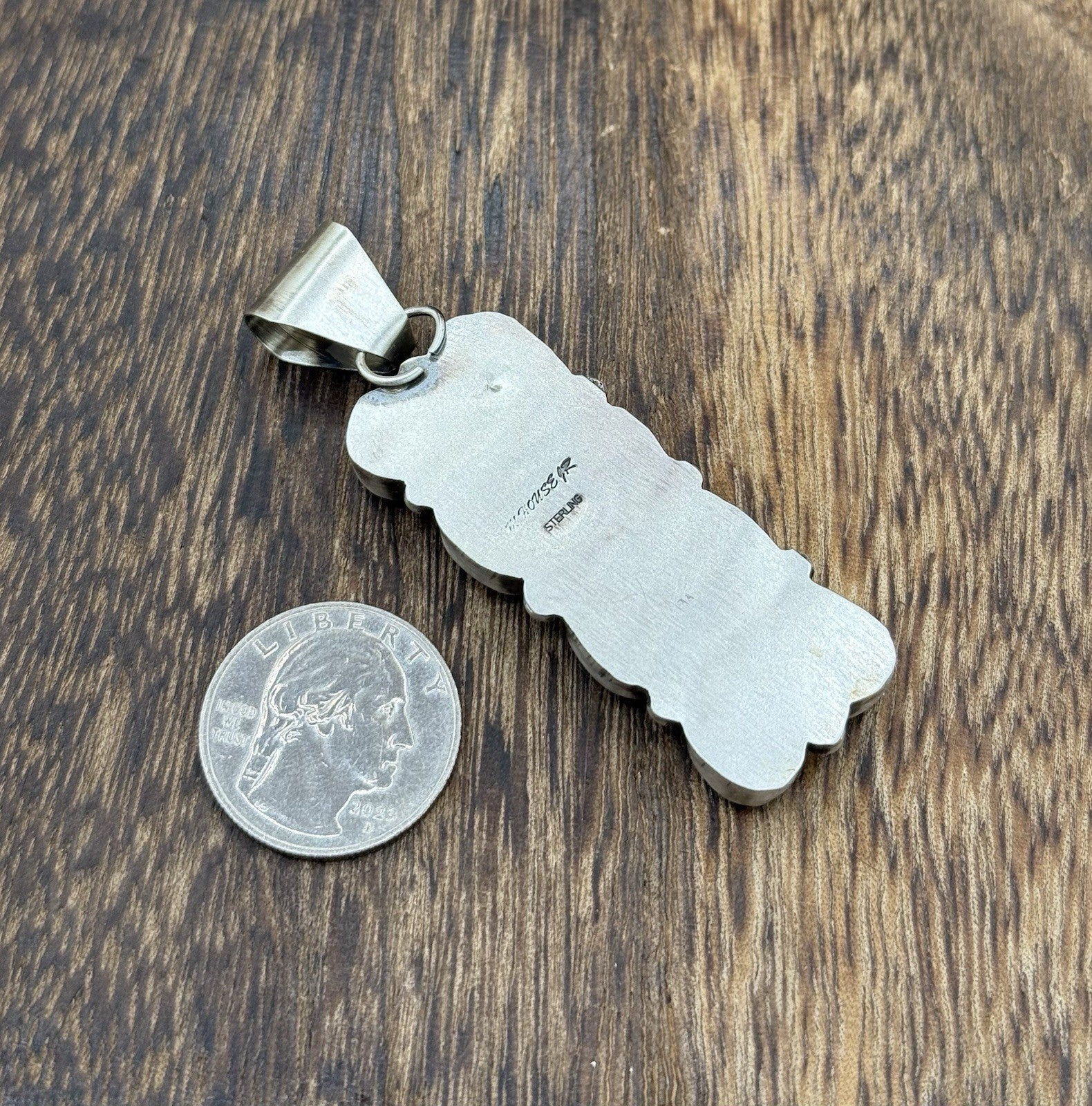 Elevate your jewelry collection with this exquisite Navajo handmade pendant. Crafted by Merle House Jr. , this stunning piece features a cluster of turquoise stones , set in a sterling silver bar setting.