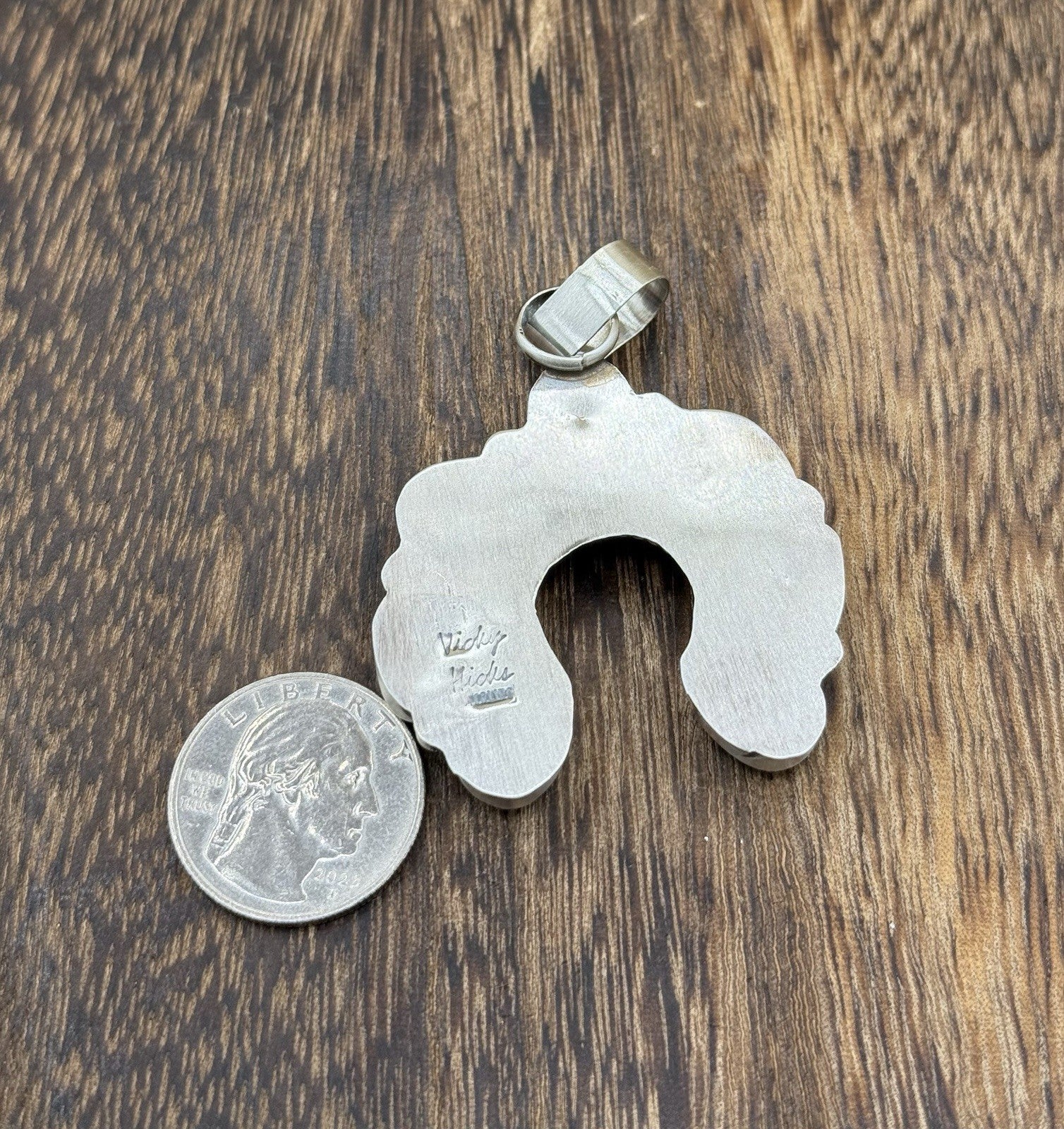 Elevate your jewelry collection with this exquisite Navajo handmade pendant. Crafted by Vicky Hicks, this stunning piece features a cluster of blue ridge stones , set in a sterling silver naja setting.
