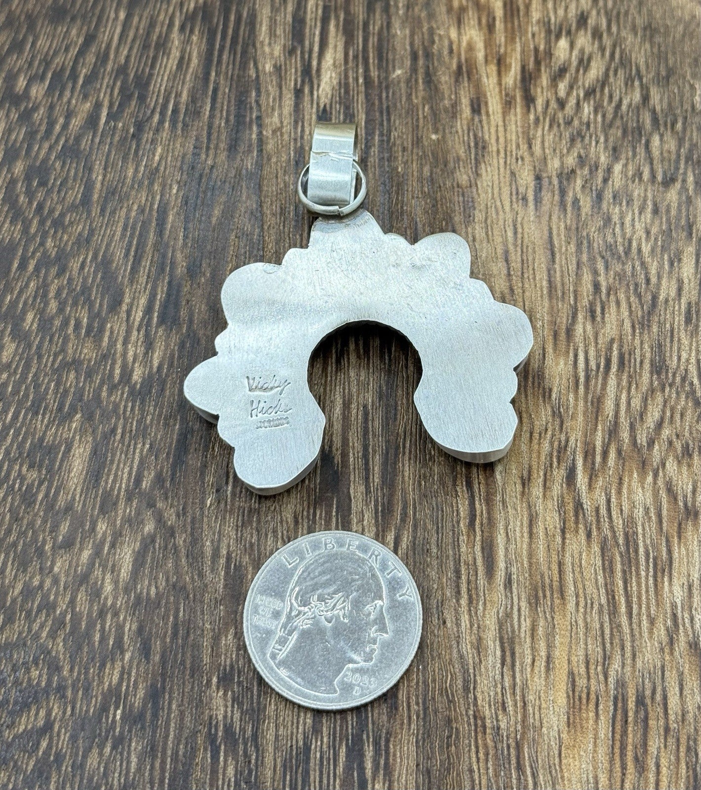 Elevate your jewelry collection with this exquisite Navajo handmade pendant. Crafted by Vicky Hicks, this stunning piece features a cluster of blue ridge stones , set in a sterling silver naja setting.