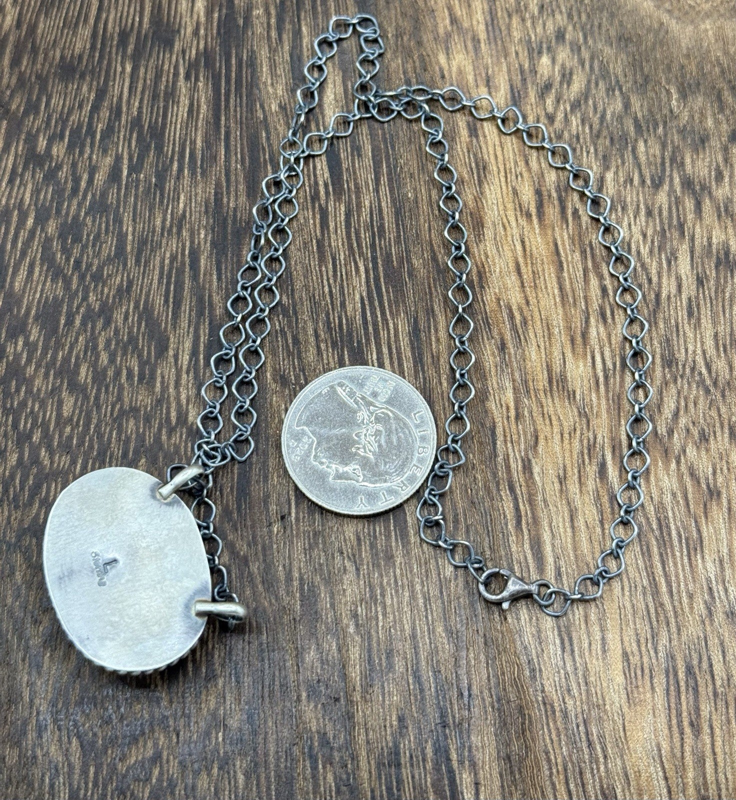 This exquisite necklace is a true work of art handcrafted by Native American artisan LeTricia Largo, The stunning bar shaped necklace features a beautiful Golden Hills Turquoise stone set in .925 sterling silver. The pendant hangs on an 18-inch chain with lobster closure, making it a perfect accessory for any occasion.