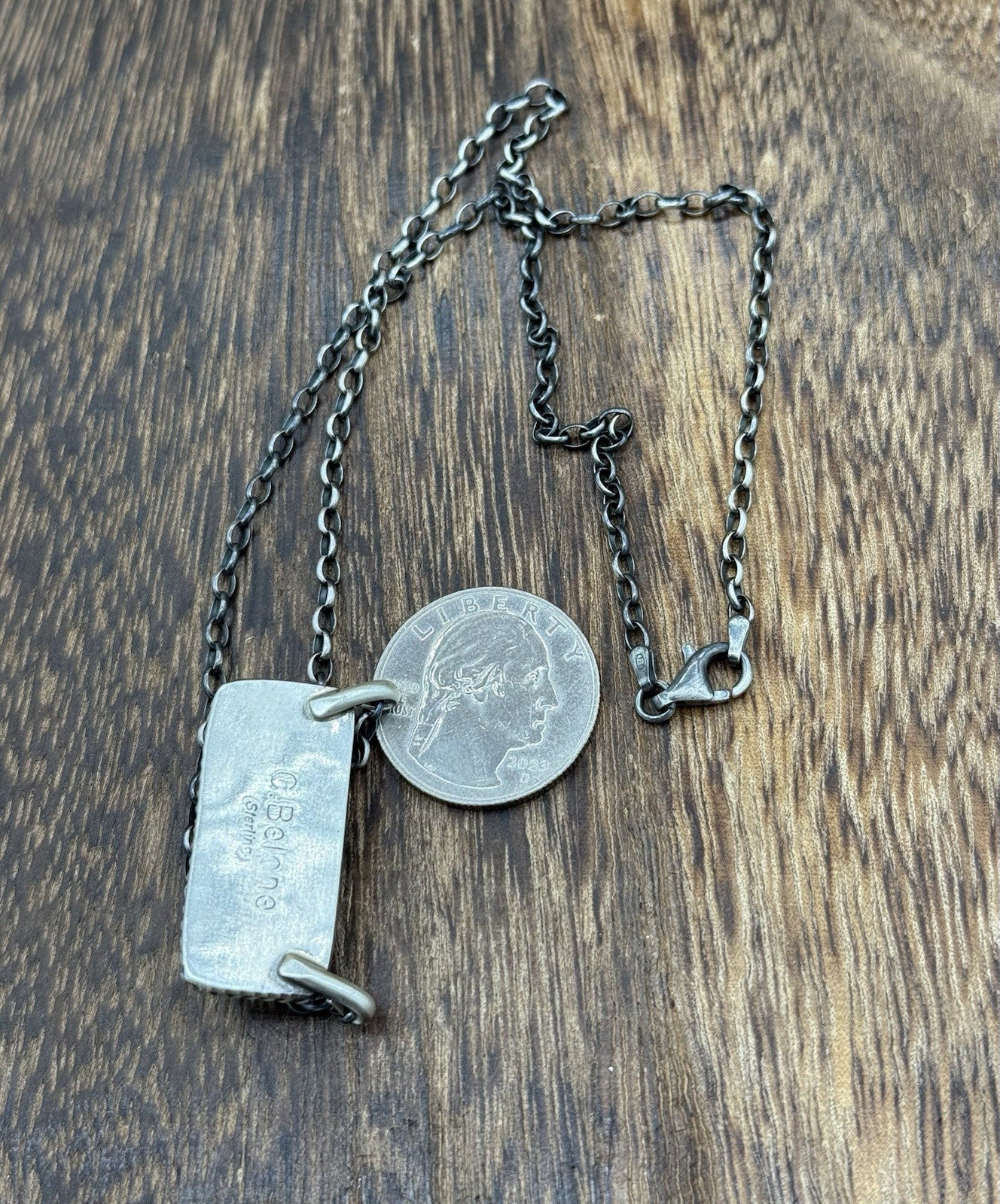 This beautiful handmade necklace is a stunning piece of Native American jewelry. Made by Navajo artisan Eugene balone , the necklace features a rectangle kingman turquoise stone set in a sterling silver on a chain. The necklace is signed by the artist.