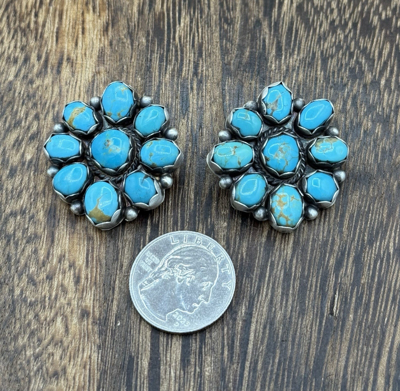 Native Navajo Handmade Sterling Silver Kingman Turquoise Cluster Post Earrings