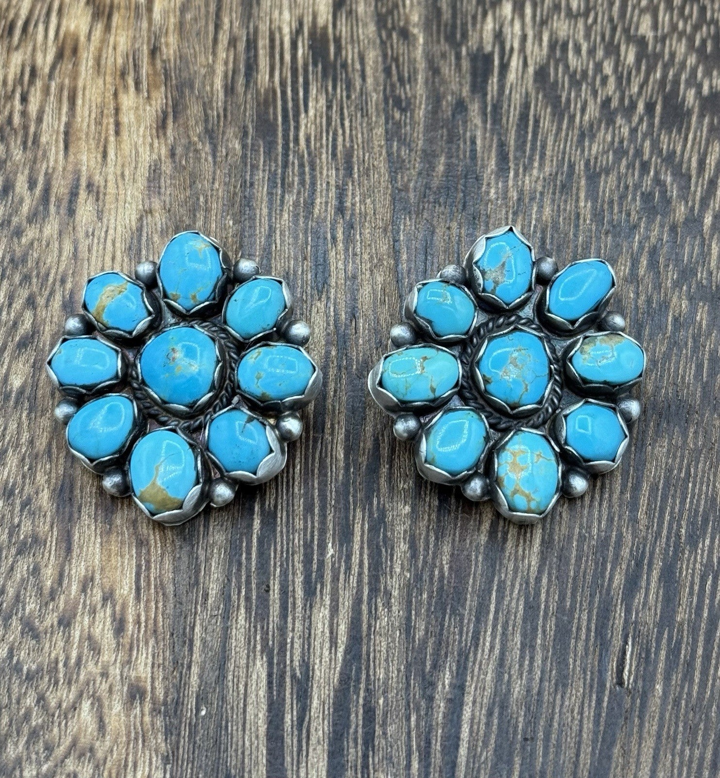 Add a touch of Native American heritage to your jewelry collection with these beautiful post stud half cluster earrings. Handmade by Navajo artisan LeTricia Largo, these sterling silver earrings feature stunning Kingman Turquoise stones in a bezel cluster setting. The old look of the earrings adds to their charm and appeal.