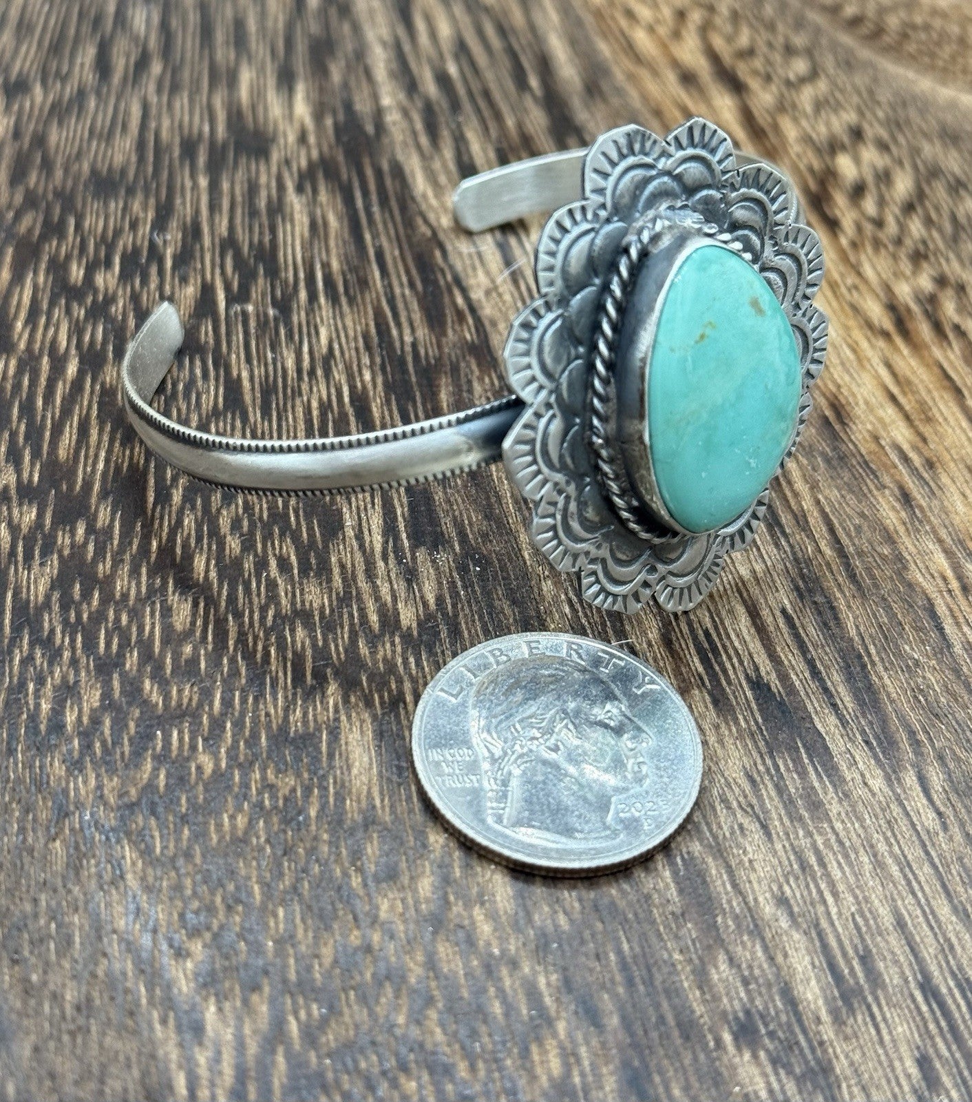Native Navajo Handmade Sterling Silver Kingman Turquoise Cuff Stamped Bracelet