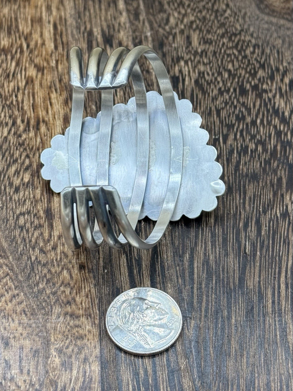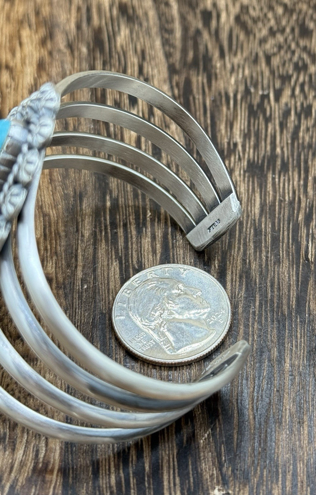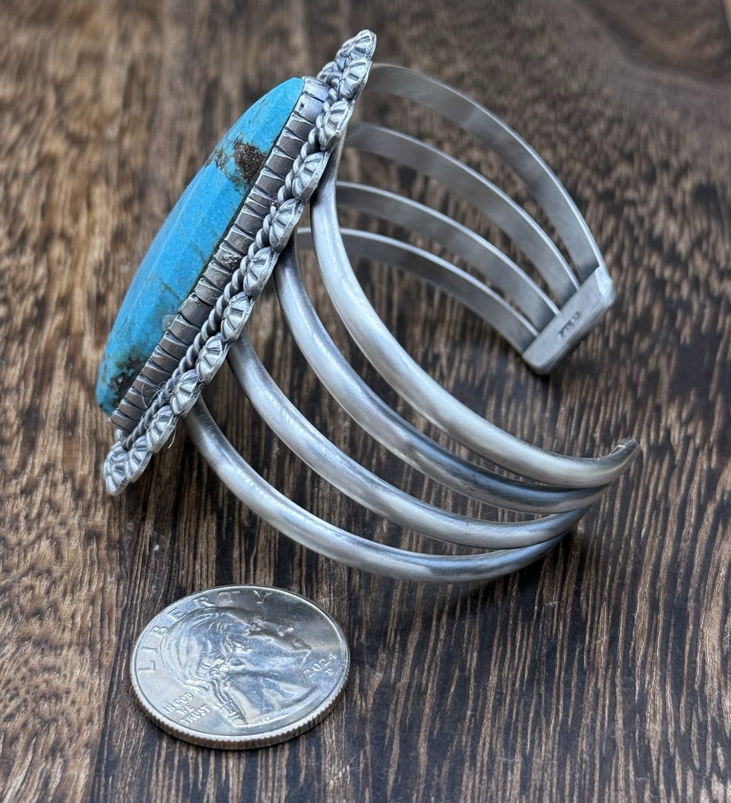 This Native American handmade cuff bracelet features A beautiful high grade natural kingman turquoise stone. The intricate design and attention to detail make this bracelet a true beauty. The Navajo tribal affiliation adds to the authenticity and uniqueness of this piece.