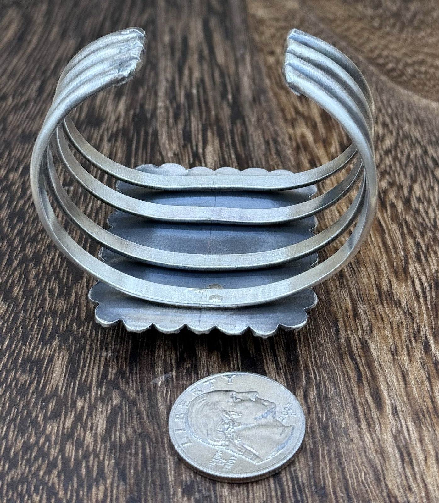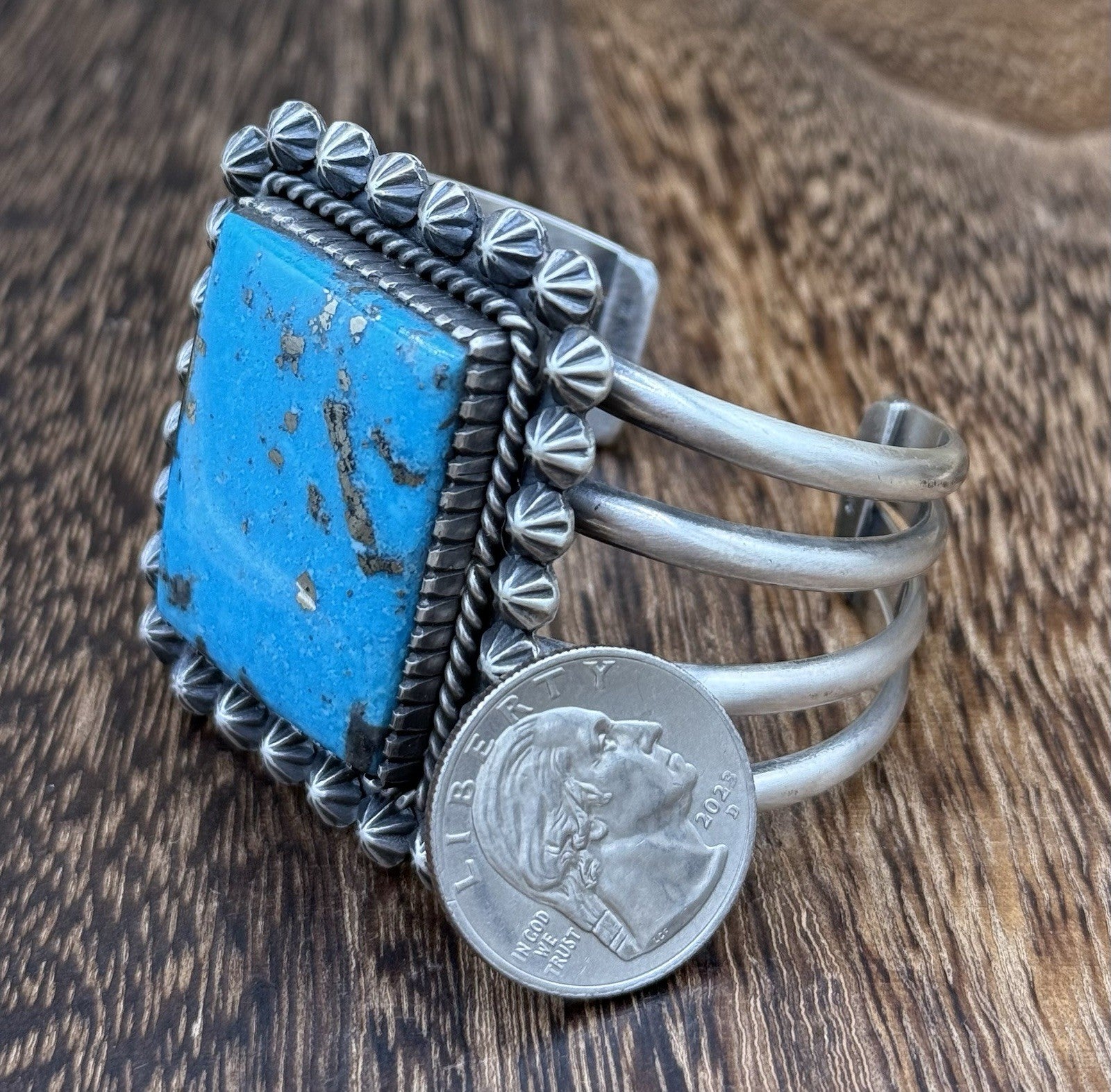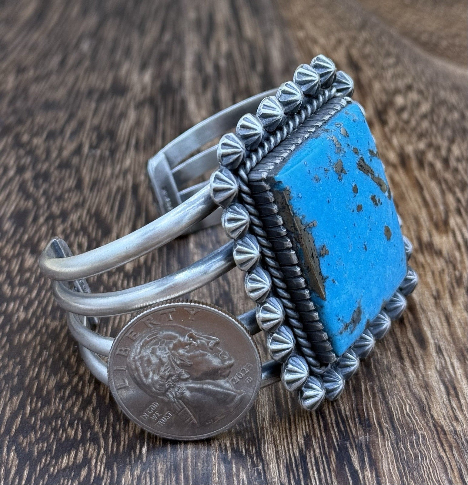 This Native American handmade cuff bracelet features A beautiful high grade natural Morenci turquoise stone. The intricate design and attention to detail make this bracelet a true beauty. The Navajo tribal affiliation adds to the authenticity and uniqueness of this piece.