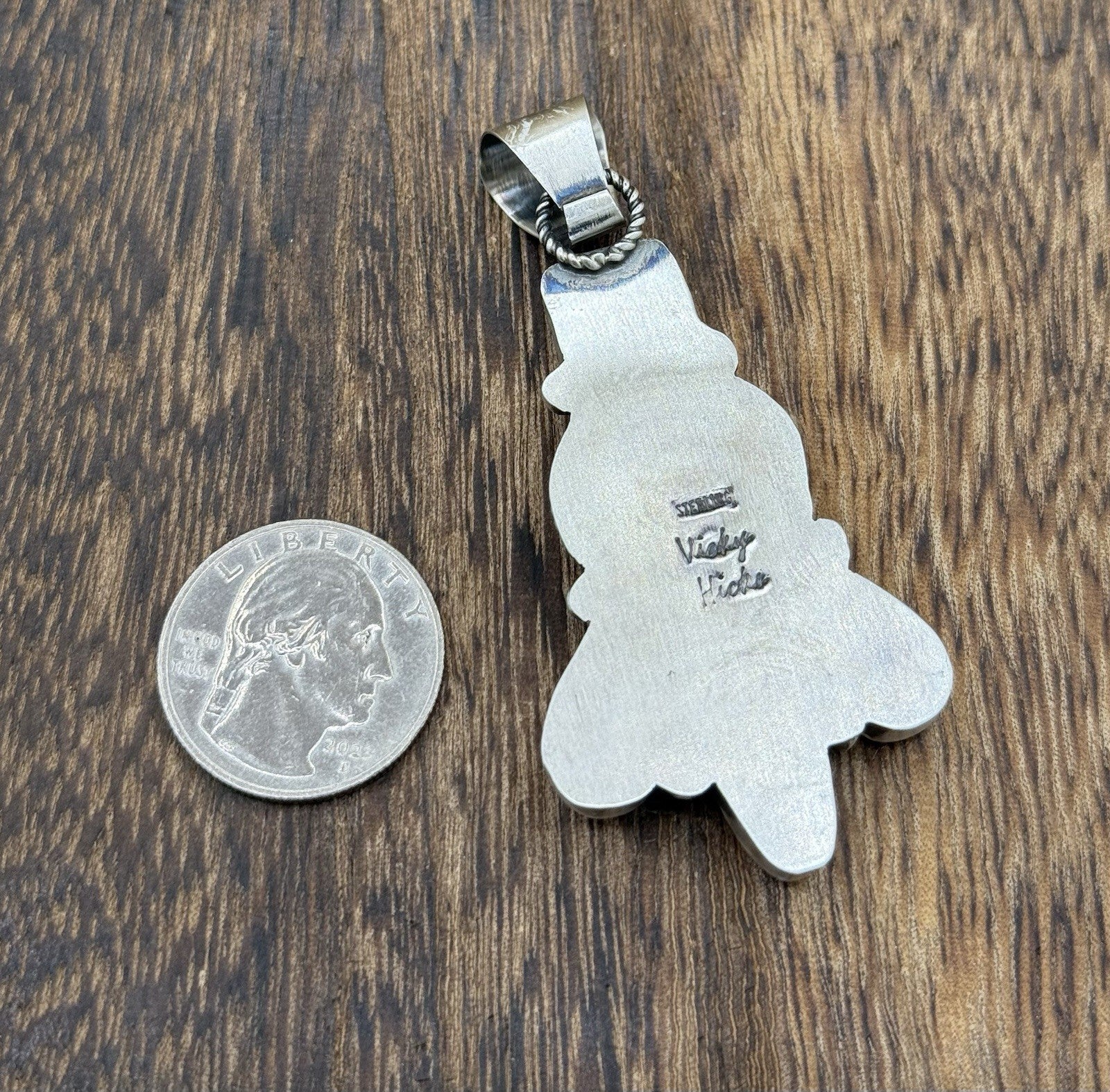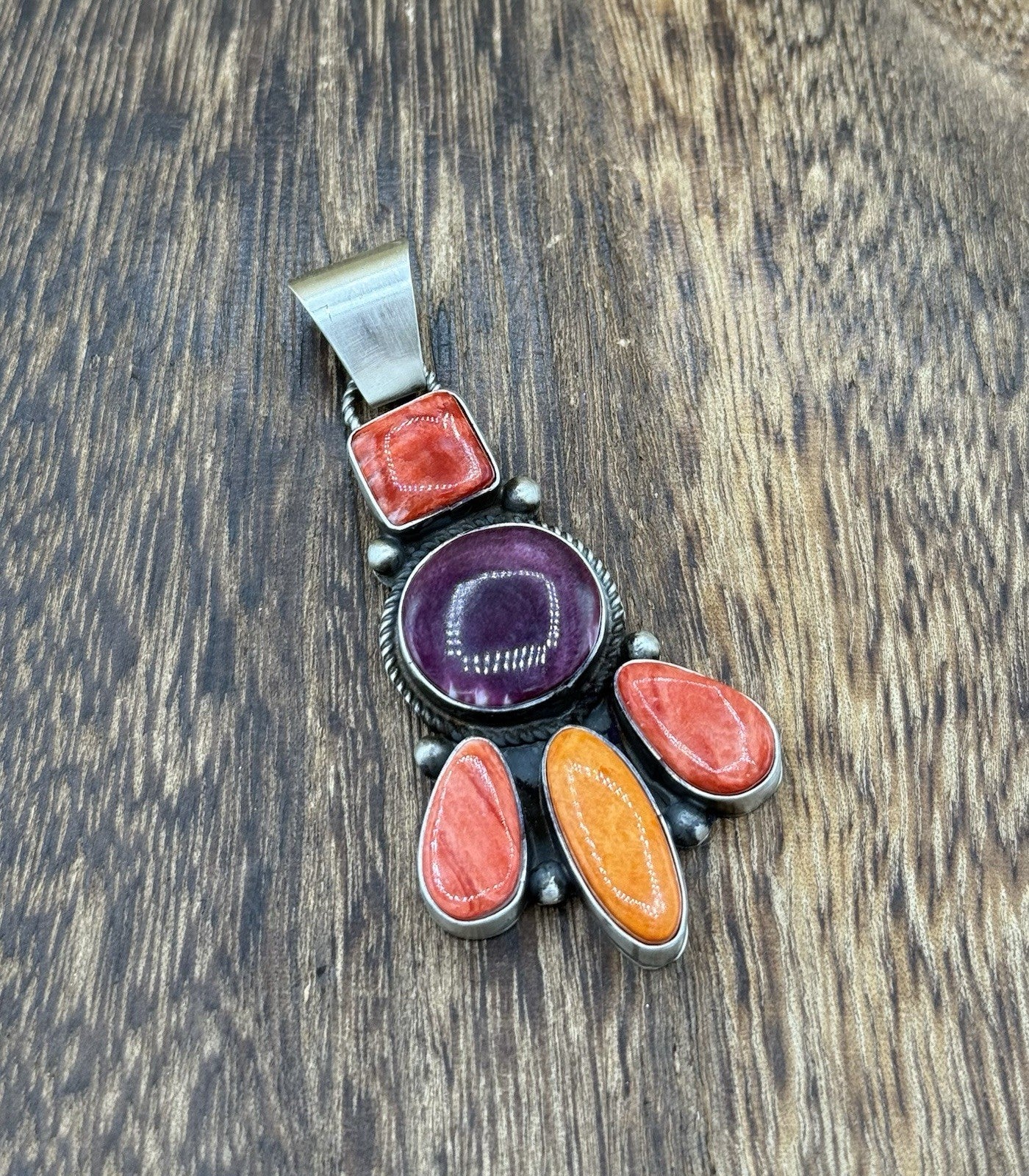 Elevate your jewelry collection with this exquisite Navajo handmade pendant. Crafted by Vicky Hicks, this stunning piece features a cluster of multi spiny oyster shell stones, set in a sterling silver setting.