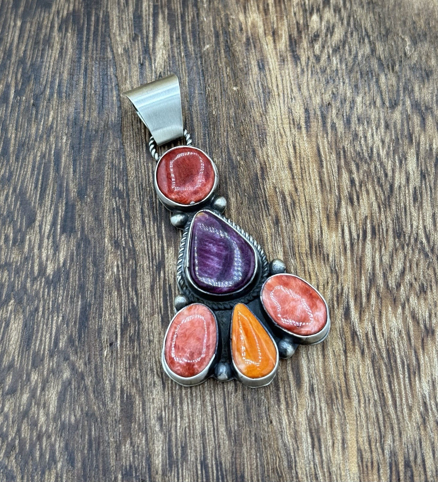Elevate your jewelry collection with this exquisite Navajo handmade pendant. Crafted by Vicky Hicks, this stunning piece features a cluster of multi spiny oyster shell stones, set in a sterling silver setting.