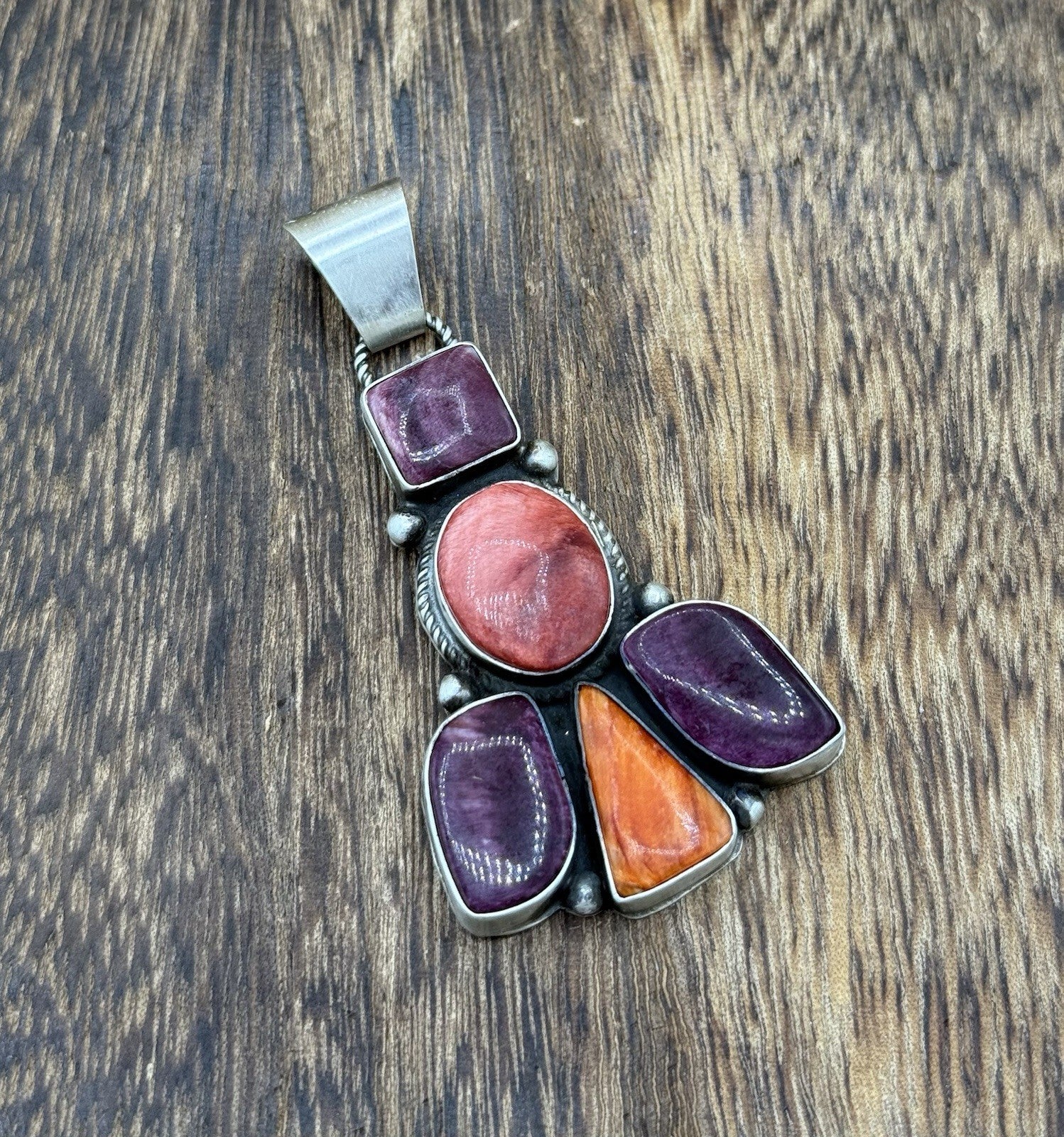 Elevate your jewelry collection with this exquisite Navajo handmade pendant. Crafted by Vicky Hicks, this stunning piece features a cluster of multi spiny oyster shell stones, set in a sterling silver setting.