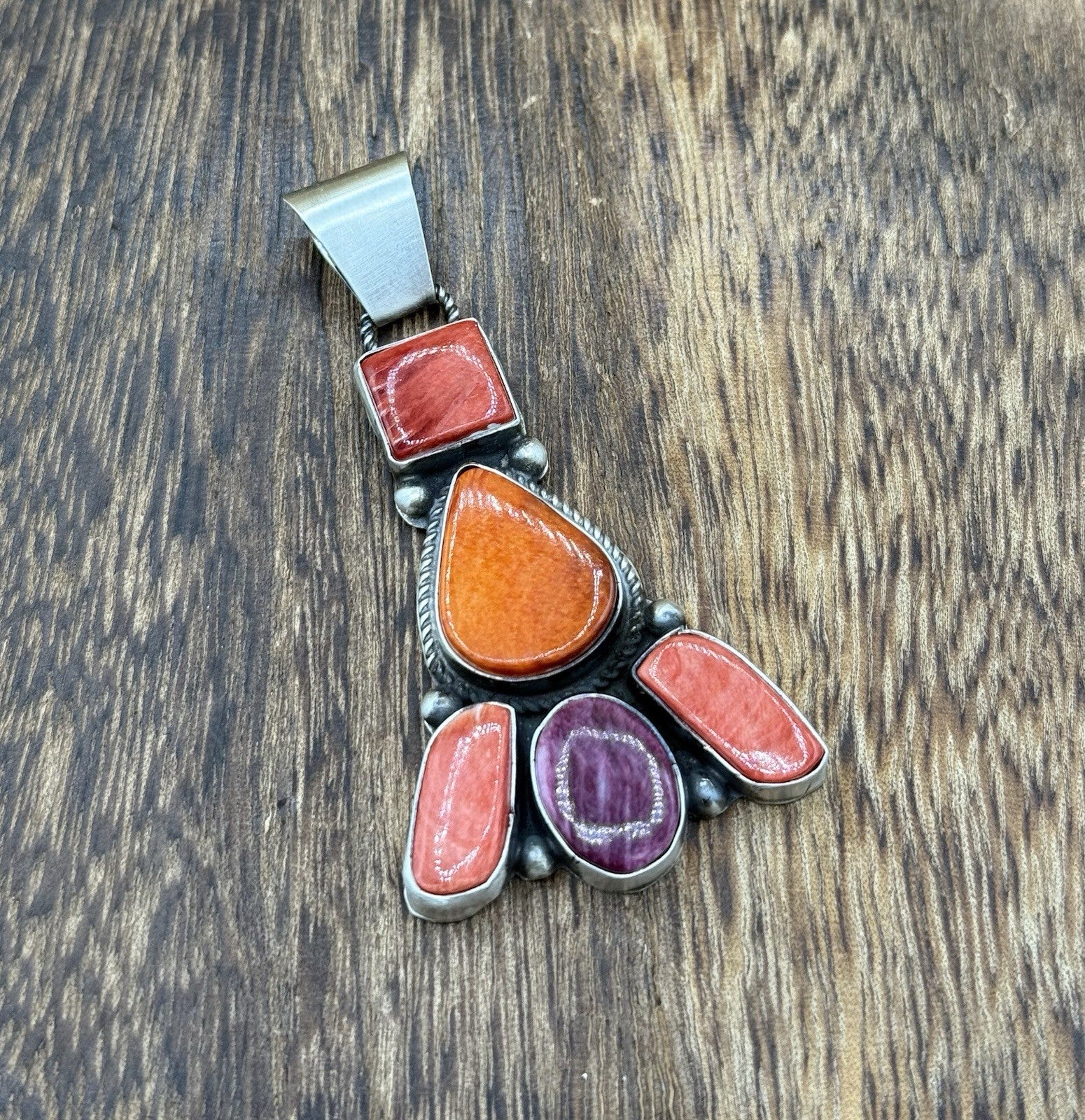Elevate your jewelry collection with this exquisite Navajo handmade pendant. Crafted by Vicky Hicks, this stunning piece features a cluster of multi spiny oyster shell stones, set in a sterling silver setting.